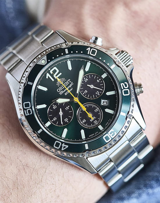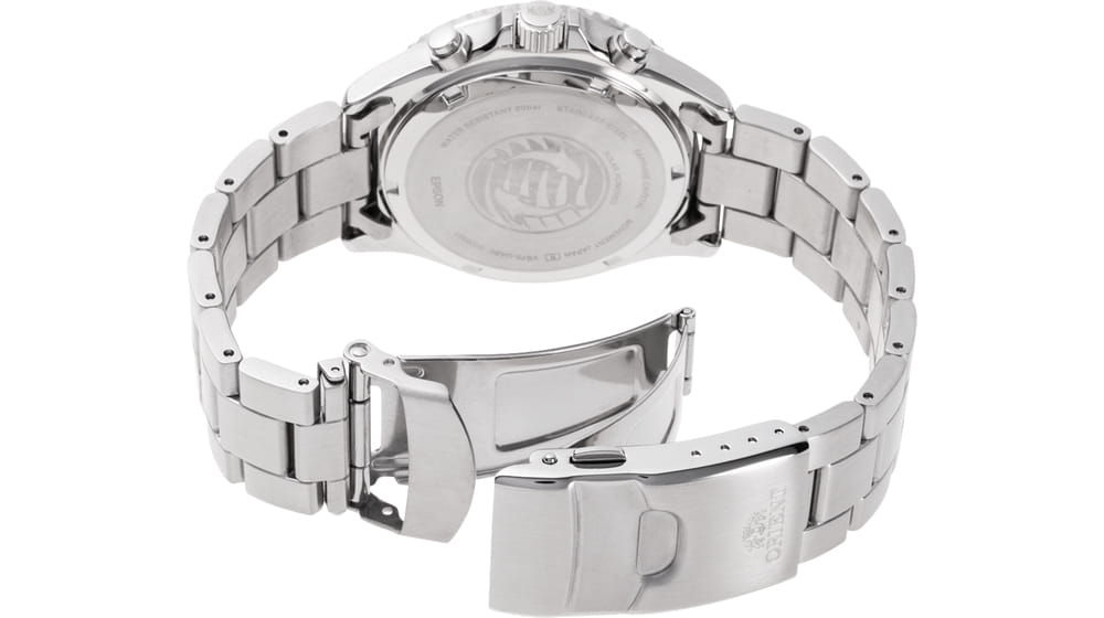 Мужские часы-хронографХронографФункция позволяет измерять отрезки времени с особой точностью: часы, минуты, секунды. Верным признаком хронографа является наличие на циферблате 3 дополнительных окошек-счётчиков. Orient Mako Chronograph Solar RA-TX0204E. Корпус часов изготовлен из нержавеющей стали. Минеральное стеклоМинеральное стеклоМинеральное стекло представляет собой искусственно выращенный минерал кварца. Такое стекло отличается особой устойчивостью к повреждениям и царапинам. Уступает по некоторым качествам сапфировому стеклу. устойчивое к появлению царапин, обладающее высокой прозрачностью. Стальной браслет на раскладной застёжкеРаскладная застёжкаТакой тип застёжки используется только на браслетах из металла. Она никогда не раскрывается полностью, происходит разделение на 2 и более частей. Раскладывающая застёжка снизит вероятность потери часов к минимуму.. Водозащита: 200 метров, позволит плавать, нырять и заниматься другими водными видами спорта.