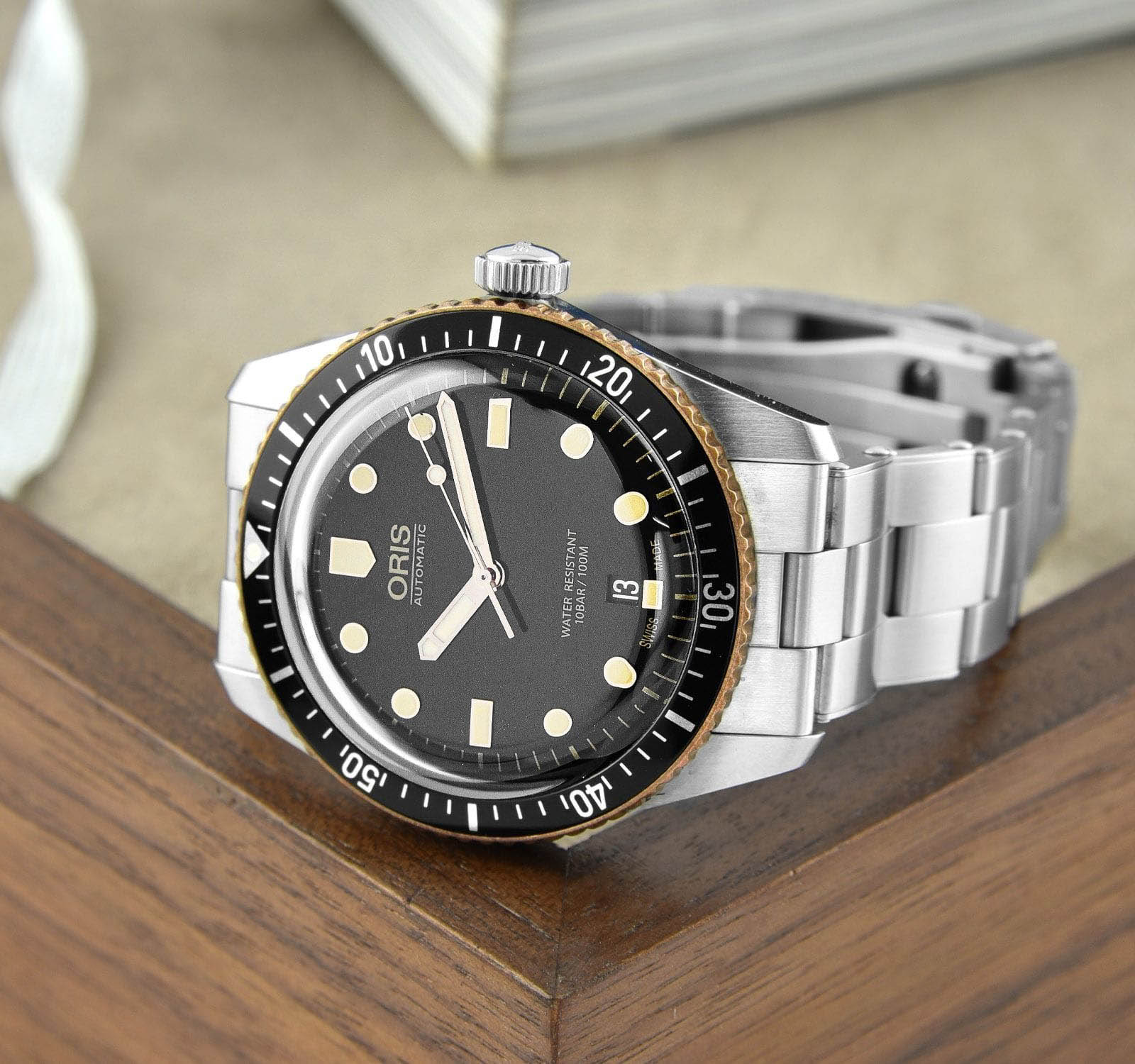 Многокомпонентный корпус из бронзы и стали, вращающийся безельБезельВнешний ободок, закрепляющий стекло. В спортивных часах так называется поворотное кольцо с делениями на циферблате, выполняет роль таймера – замеряет отрезки времени на шкале. Неподвижный безель – элемент декора. Однонаправленно вращающийся безель на дайверских часах позволяет фиксировать моменты погружения и выныривания на поверхность. с минутной шкалой . Сапфировое стеклоСапфировое стеклоПрочный и надёжный материал из кристалла сапфира синтетического происхождения, характеризующийся особой твёрдостью и устойчивостью к царапинам и повреждениям., выпуклое с обеих сторон, внутреннее антибликовое покрытие. Прозрачная задняя крышка из сапфирового стеклаСапфировое стеклоПрочный и надёжный материал из кристалла сапфира синтетического происхождения, характеризующийся особой твёрдостью и устойчивостью к царапинам и повреждениям.. Стрелки и метки с люминесцентным покрытиемЛюминесцентное покрытиеПозволяет считывать показания времени в темноте. Производители наносят на стрелки, часовые индексы, безель или поверхность циферблата светонакопительный состав, дающий холодное свечение.. Завинчивающаяся заводная головка.