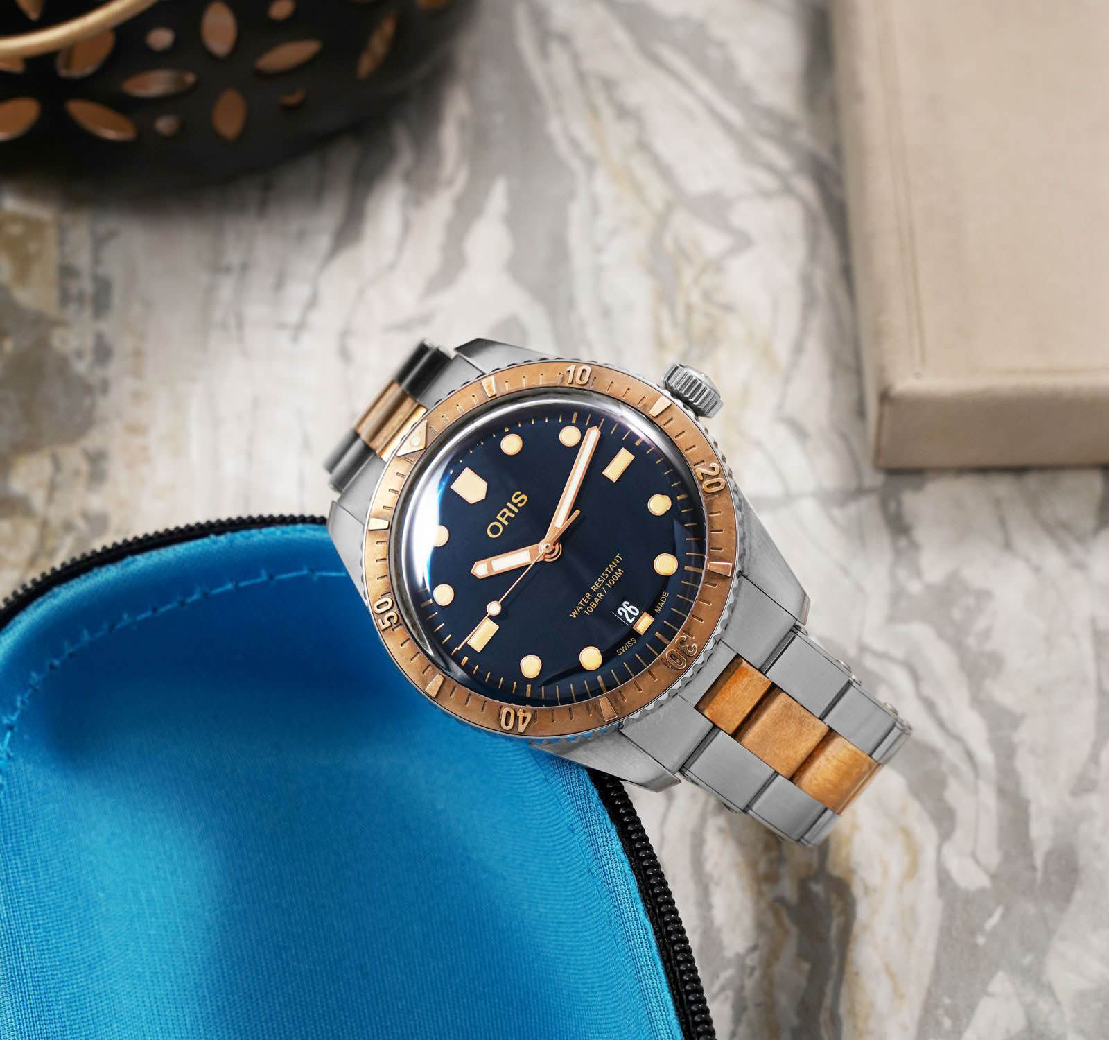 Многокомпонентный корпус из бронзы и стали, вращающийся бронзовый безельБезельВнешний ободок, закрепляющий стекло. В спортивных часах так называется поворотное кольцо с делениями на циферблате, выполняет роль таймера – замеряет отрезки времени на шкале. Неподвижный безель – элемент декора. Однонаправленно вращающийся безель на дайверских часах позволяет фиксировать моменты погружения и выныривания на поверхность. с минутной шкалой . Сапфировое стеклоСапфировое стеклоПрочный и надёжный материал из кристалла сапфира синтетического происхождения, характеризующийся особой твёрдостью и устойчивостью к царапинам и повреждениям., выпуклое с обеих сторон, внутреннее антибликовое покрытие. Прозрачная задняя крышка из сапфирового стеклаСапфировое стеклоПрочный и надёжный материал из кристалла сапфира синтетического происхождения, характеризующийся особой твёрдостью и устойчивостью к царапинам и повреждениям.. Стрелки и метки с люминесцентным покрытиемЛюминесцентное покрытиеПозволяет считывать показания времени в темноте. Производители наносят на стрелки, часовые индексы, безель или поверхность циферблата светонакопительный состав, дающий холодное свечение.. Завинчивающаяся заводная головка.