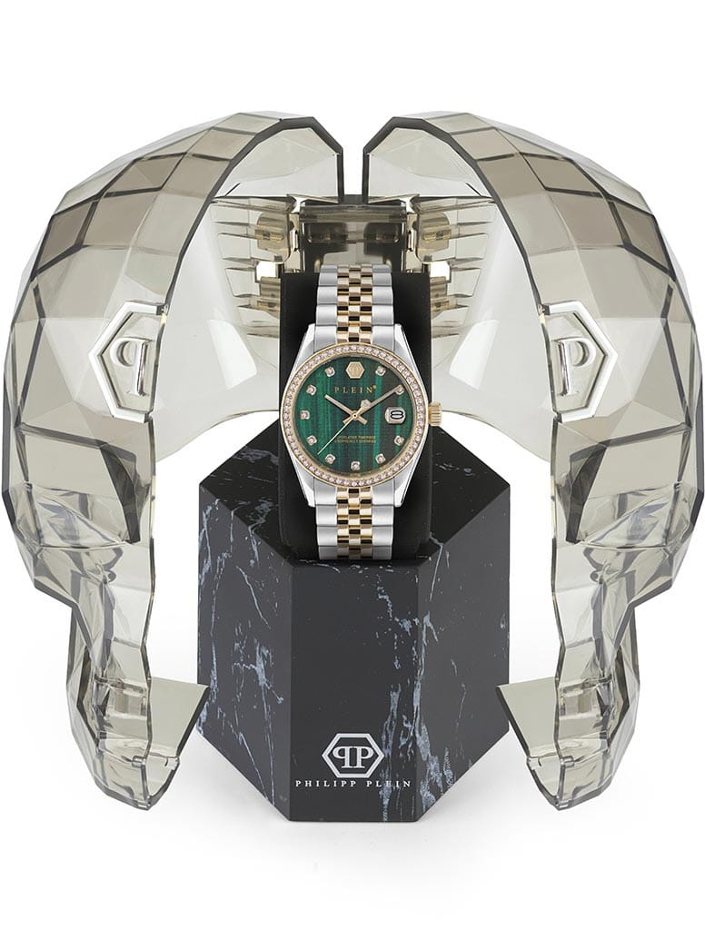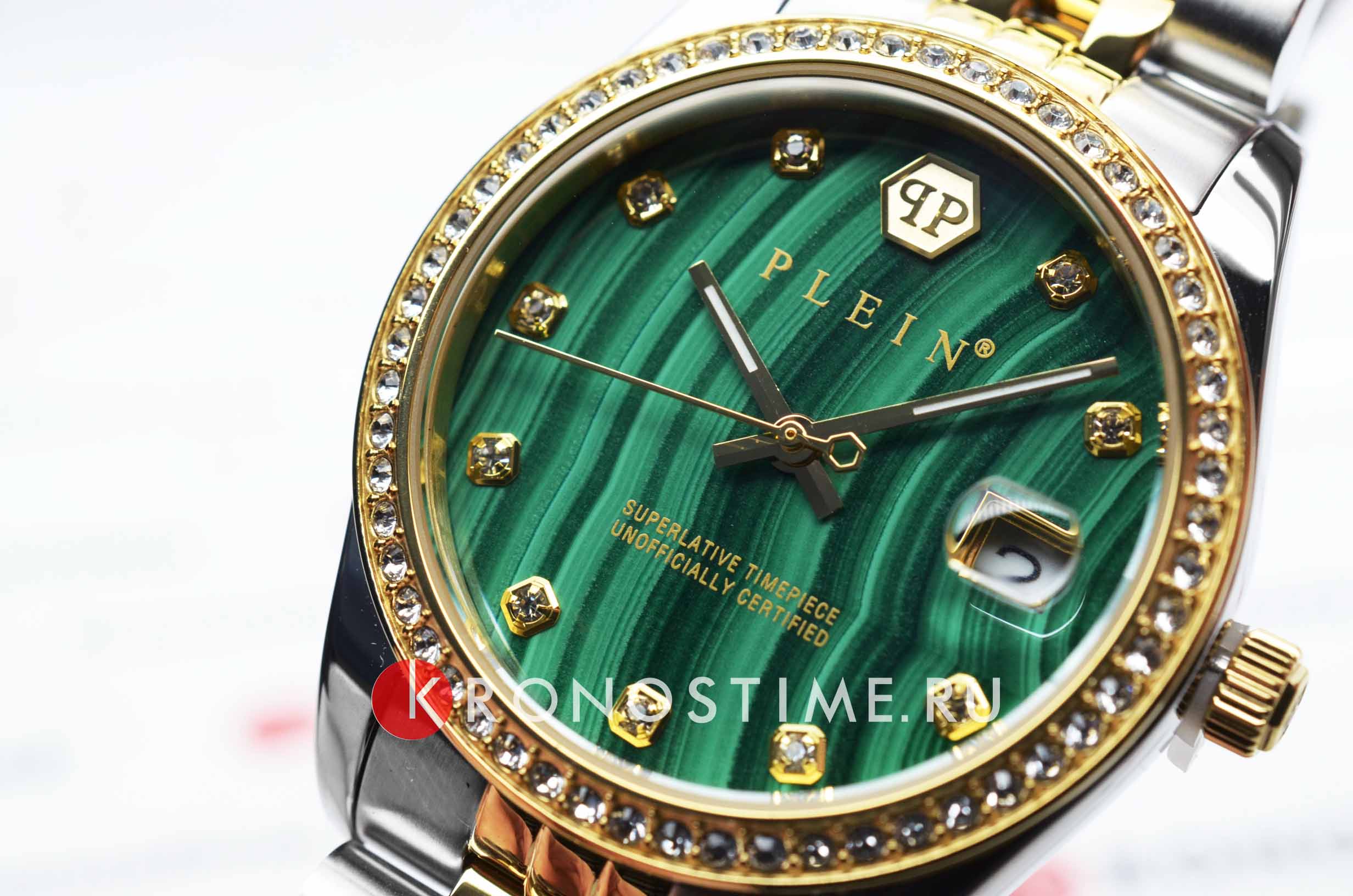 Яркие женские часы Philipp Plein Date Superlative PWYAA0523 c с минеральным стекломМинеральное стеклоМинеральное стекло представляет собой искусственно выращенный минерал кварца. Такое стекло отличается особой устойчивостью к повреждениям и царапинам. Уступает по некоторым качествам сапфировому стеклу.. Особенные часы для особенных женщин! Ослепительный аксессуар, демонстрирующий роскошь и изысканность.Часы с круглым стальным корпусом с IP-покрытиемIP-покрытиеМетод ионного напыления. Демонстрирует повышенную устойчивость к истиранию, окислению и химическим веществам. Под воздействием высокого давления и температуры около 1500°C молекулы металла надёжно соединяются с частицами корпуса часов.. Перламутровый циферблат с метками в виде точек, украшенных кристаллами. Люминесцентное покрытиеЛюминесцентное покрытиеПозволяет считывать показания времени в темноте. Производители наносят на стрелки, часовые индексы, безель или поверхность циферблата светонакопительный состав, дающий холодное свечение. стрелок. Окошко даты с увеличительным стеклом находится в положении 3 часа. Рифленая заводная головка. Стальной браслет на застёжке бабочка с кнопкамиЗастёжка "бабочка"Такой вид застёжки дополняется предохранителями, помогающими избежать случайного раскрытия браслета. Обладают изящным исполнением.