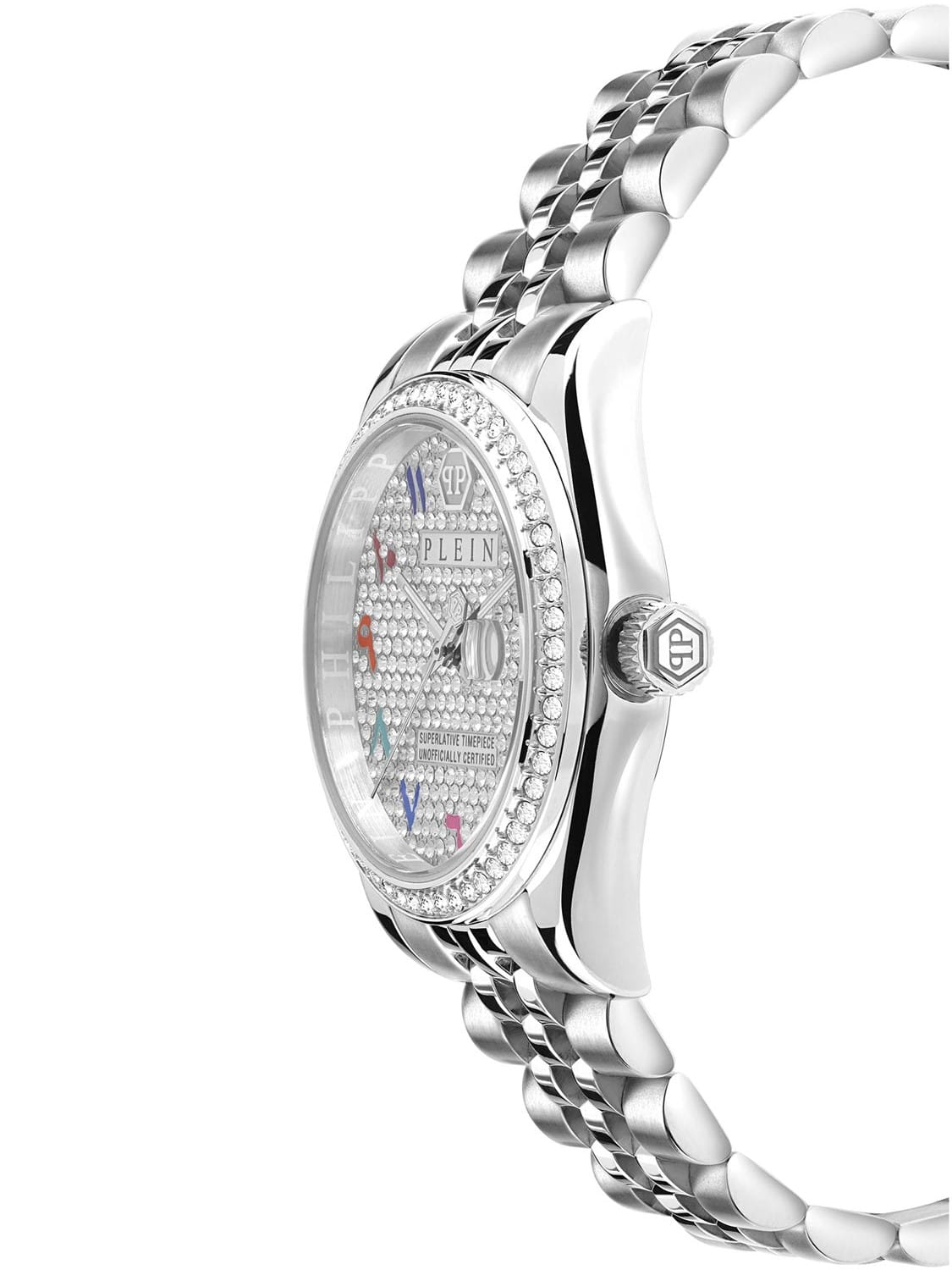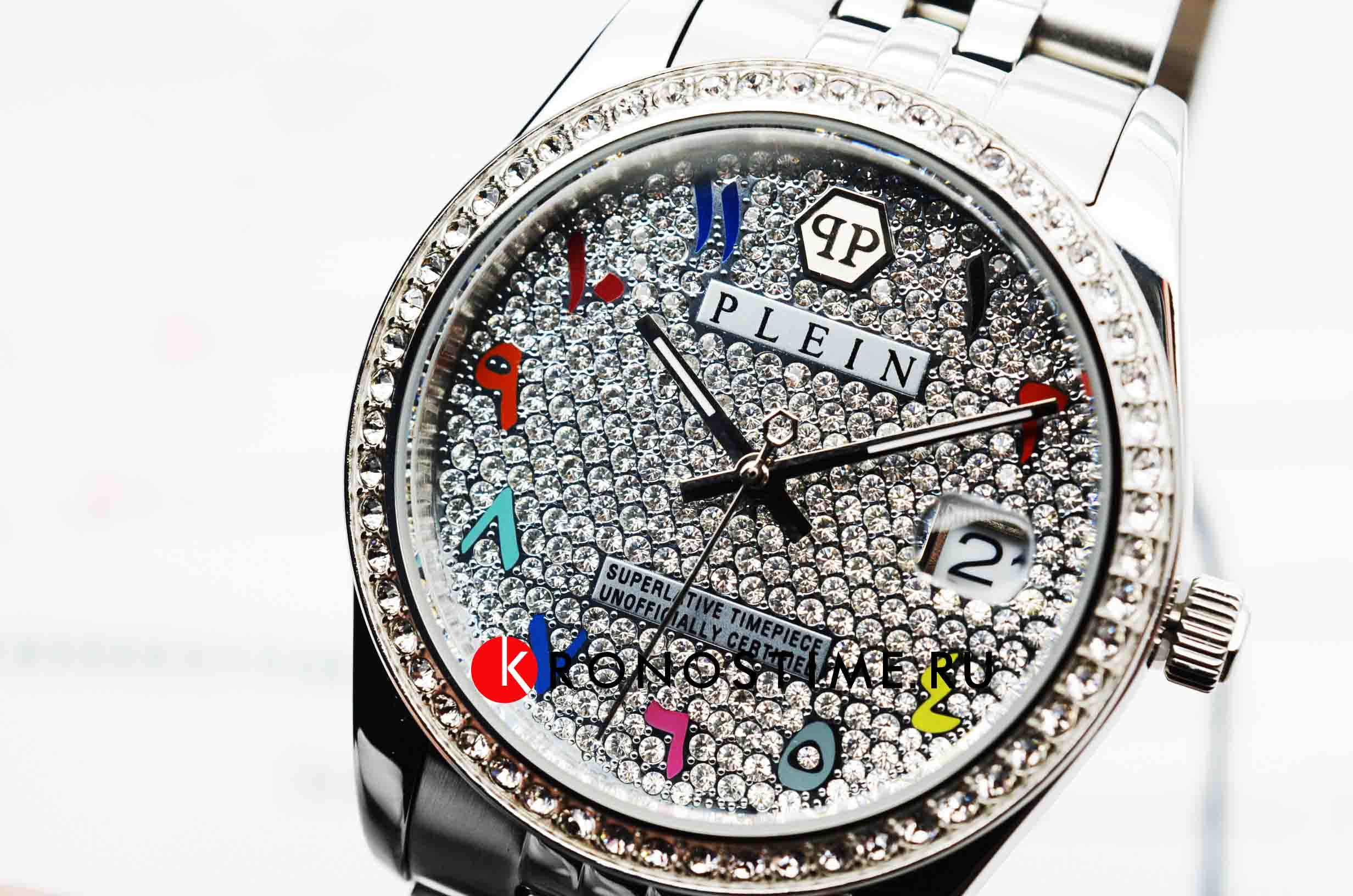 Яркие женские часы  Philipp Plein Date Superlative PWYAA0723 c с минеральным стекломМинеральное стеклоМинеральное стекло представляет собой искусственно выращенный минерал кварца. Такое стекло отличается особой устойчивостью к повреждениям и царапинам. Уступает по некоторым качествам сапфировому стеклу.. Особенные часы для особенных женщин! Ослепительный аксессуар, демонстрирующий роскошь и изысканность.Часы с круглым стальным корпусом. Перламутровый циферблат с метками в виде точек, украшенных кристаллами. Люминесцентное покрытиеЛюминесцентное покрытиеПозволяет считывать показания времени в темноте. Производители наносят на стрелки, часовые индексы, безель или поверхность циферблата светонакопительный состав, дающий холодное свечение. стрелок. Окошко даты с увеличительным стеклом находится в положении 3 часа. Рифленая заводная головка. Стальной браслет на застёжке бабочка с кнопкамиЗастёжка "бабочка"Такой вид застёжки дополняется предохранителями, помогающими избежать случайного раскрытия браслета. Обладают изящным исполнением.