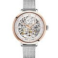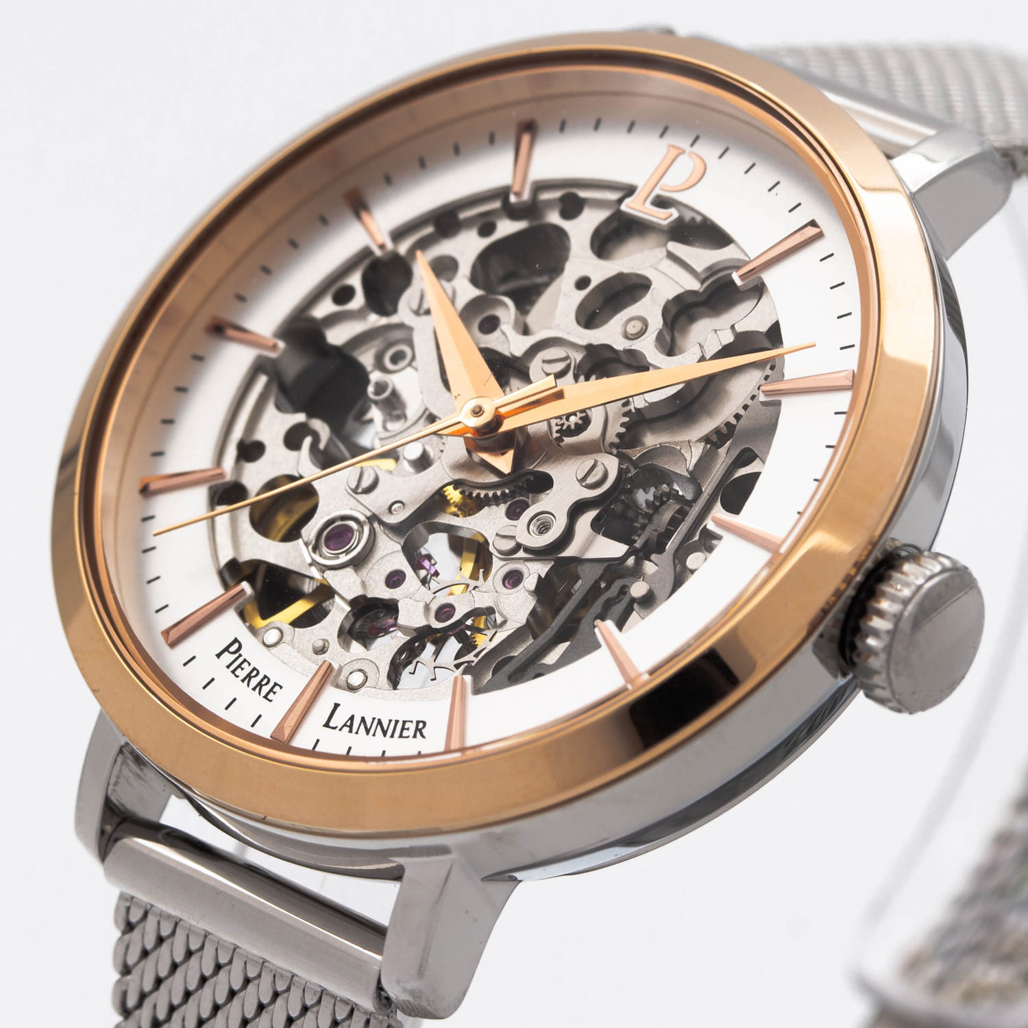 Женские механические часы с автоподзаводом Pierre Lannier Automatic 312B628. Минеральное стеклоМинеральное стеклоМинеральное стекло представляет собой искусственно выращенный минерал кварца. Такое стекло отличается особой устойчивостью к повреждениям и царапинам. Уступает по некоторым качествам сапфировому стеклу. устойчивое к мелким механическим повреждениям. Скелетонизированный серебристый циферблат. Центральные часовая, минутная и секундная стрелки. Корпус выполнен из полированной нержавеющей стали . Неподвижный безельБезельВнешний ободок, закрепляющий стекло. В спортивных часах так называется поворотное кольцо с делениями на циферблате, выполняет роль таймера – замеряет отрезки времени на шкале. Неподвижный безель – элемент декора. Однонаправленно вращающийся безель на дайверских часах позволяет фиксировать моменты погружения и выныривания на поверхность. из нержавеющей стали с IP-покрытиемIP-покрытиеМетод ионного напыления. Демонстрирует повышенную устойчивость к истиранию, окислению и химическим веществам. Под воздействием высокого давления и температуры около 1500°C молекулы металла надёжно соединяются с частицами корпуса часов. . Водостойкость: 30 метров, позволит защитить корпус от случайных брызг или капель дождя. Стальной браслет на раскладной застёжкеРаскладная застёжкаТакой тип застёжки используется только на браслетах из металла. Она никогда не раскрывается полностью, происходит разделение на 2 и более частей. Раскладывающая застёжка снизит вероятность потери часов к минимуму..