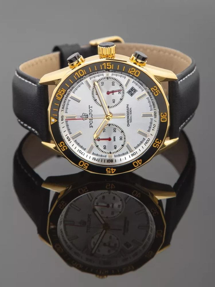 Poljot 6S21.186259 — яркие мужские часы с выразительным спортивным характером и акцентом на функциональность. Корпус из нержавеющей стали с PVD-покрытиемPVDУльтратонкое покрытие наносится в технике вакуумного напыления, сочетает в себе нитрид титана особой прочности со слоем золота или оксида хрома. Несёт в себе декоративную или защитную функцию. придаёт модели надёжность и солидность, а насыщенный циферблат с контрастными счётчиками хронографаХронографФункция позволяет измерять отрезки времени с особой точностью: часы, минуты, секунды. Верным признаком хронографа является наличие на циферблате 3 дополнительных окошек-счётчиков. создаёт динамичный и энергичный облик. БезельБезельВнешний ободок, закрепляющий стекло. В спортивных часах так называется поворотное кольцо с делениями на циферблате, выполняет роль таймера – замеряет отрезки времени на шкале. Неподвижный безель – элемент декора. Однонаправленно вращающийся безель на дайверских часах позволяет фиксировать моменты погружения и выныривания на поверхность. с PVD-покрытиемPVDУльтратонкое покрытие наносится в технике вакуумного напыления, сочетает в себе нитрид титана особой прочности со слоем золота или оксида хрома. Несёт в себе декоративную или защитную функцию.. Широкие стрелки и метки с люминесцентным покрытиемЛюминесцентное покрытиеПозволяет считывать показания времени в темноте. Производители наносят на стрелки, часовые индексы, безель или поверхность циферблата светонакопительный состав, дающий холодное свечение. обеспечивают отличную читаемость в любых условиях, а внешний обод с минутной шкалой подчёркивает спортивный стиль. Окно даты добавляет практичности. Прочное минеральное стеклоМинеральное стеклоМинеральное стекло представляет собой искусственно выращенный минерал кварца. Такое стекло отличается особой устойчивостью к повреждениям и царапинам. Уступает по некоторым качествам сапфировому стеклу. надёжно защищает циферблат от повреждений, а ремешок из натуральной кожи гармонично дополняет контрастную цветовую палитру. Poljot — это смелое сочетание спортивной энергии, точности и современного дизайна для активного и уверенного мужчины.