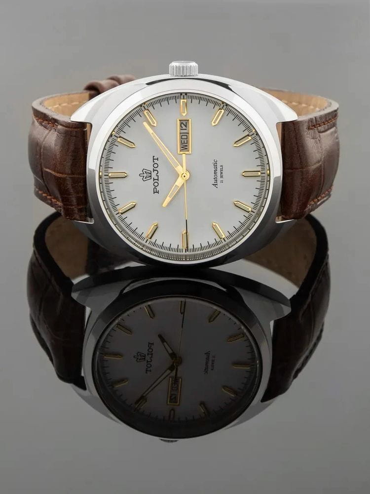 Poljot 8205.241276 — элегантные механические часы с автоподзаводом, сочетающем силу и изысканность. Корпус из нержавеющей стали подчеркивает надёжность и лаконичность дизайна, а глубокий циферблат с золотистыми стрелками придаёт модели благородный акцент. Проверенный японский механизм Miyota 8205 обеспечивает точность хода и долговечность, а плавное движение секундной стрелки подчёркивает качество сборки. Метки и стрелки с люминесцентным покрытиемЛюминесцентное покрытиеПозволяет считывать показания времени в темноте. Производители наносят на стрелки, часовые индексы, безель или поверхность циферблата светонакопительный состав, дающий холодное свечение. обеспечивают отличную читаемость при любом освещении, а окно даты добавляет практичности. Прочное минеральное стеклоМинеральное стеклоМинеральное стекло представляет собой искусственно выращенный минерал кварца. Такое стекло отличается особой устойчивостью к повреждениям и царапинам. Уступает по некоторым качествам сапфировому стеклу. защищает циферблат от царапин, а ремешок из натуральной кожи завершает утончённый облик модели. Poljot — гармония классики и современной механики, созданная для тех, кто ценит традиции и индивидуальность в каждой детали. В комплекте дополнительный ремешок с напульсником.