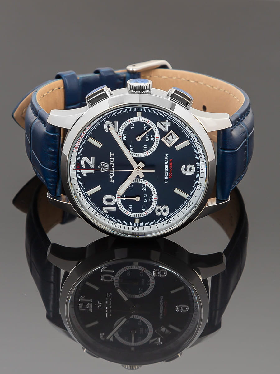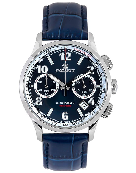 Poljot 6S21.901214 — современные мужские часы с выразительным спортивным дизайном и надёжной функциональностью. Корпус из нержавеющей стали подчёркивает прочность и уверенный характер модели, а глубокий циферблат с счётчиками хронографаХронографФункция позволяет измерять отрезки времени с особой точностью: часы, минуты, секунды. Верным признаком хронографа является наличие на циферблате 3 дополнительных окошек-счётчиков. и аккуратным окном даты придаёт часам динамичный вид. Контрастные стрелки и метки с люминесцентным покрытиемЛюминесцентное покрытиеПозволяет считывать показания времени в темноте. Производители наносят на стрелки, часовые индексы, безель или поверхность циферблата светонакопительный состав, дающий холодное свечение. обеспечивают удобство считывания информации в любое время суток, а внешняя шкала тахиметраТахиметрРазмеченная шкала, располагается на ободке или безеле часов. Тахиметр позволяет рассчитать скорость на определённом участке пути, расстояние измеряется в километрах или милях. добавляет спортивную функциональность. Прочное минеральное стеклоМинеральное стеклоМинеральное стекло представляет собой искусственно выращенный минерал кварца. Такое стекло отличается особой устойчивостью к повреждениям и царапинам. Уступает по некоторым качествам сапфировому стеклу. защищает циферблат от царапин, а ремешок из натуральной кожи гарантирует комфорт и элегантную посадку на запястье. Poljot — это гармония классики и спортивного духа, созданная для мужчин, ценящих точность, надёжность и уверенный стиль.