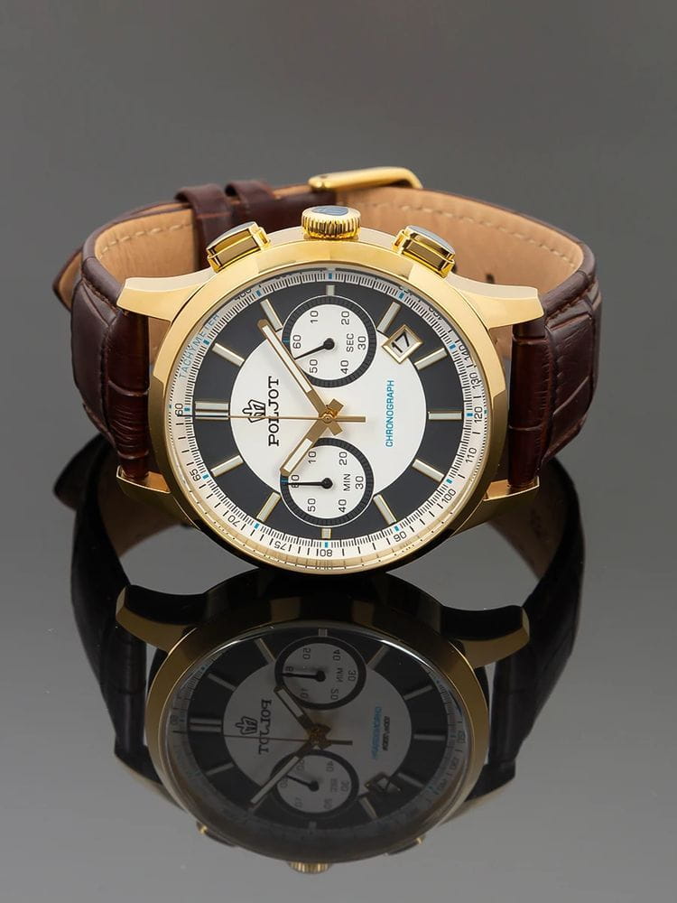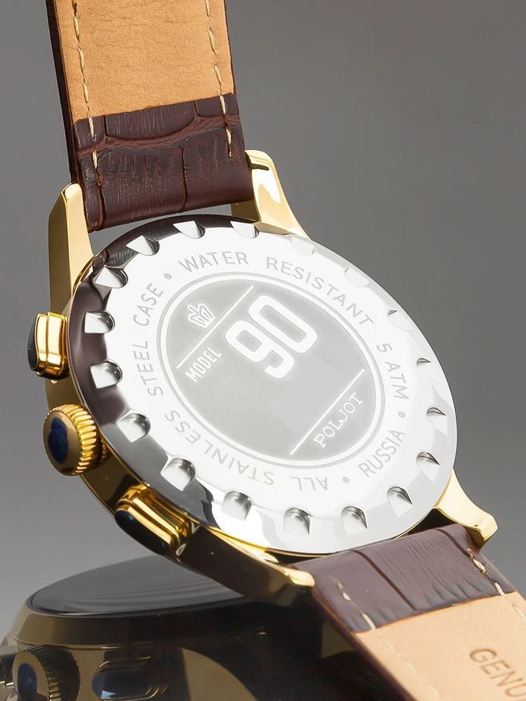 Poljot 6S21.906217 — современные мужские часы с выразительным спортивным дизайном и надёжной функциональностью. Корпус из нержавеющей стали с с PVD-покрытиемPVDУльтратонкое покрытие наносится в технике вакуумного напыления, сочетает в себе нитрид титана особой прочности со слоем золота или оксида хрома. Несёт в себе декоративную или защитную функцию. подчёркивает прочность и уверенный характер модели, а глубокий циферблат с счётчиками хронографаХронографФункция позволяет измерять отрезки времени с особой точностью: часы, минуты, секунды. Верным признаком хронографа является наличие на циферблате 3 дополнительных окошек-счётчиков. и аккуратным окном даты придаёт часам динамичный вид. Контрастные стрелки и метки с люминесцентным покрытиемЛюминесцентное покрытиеПозволяет считывать показания времени в темноте. Производители наносят на стрелки, часовые индексы, безель или поверхность циферблата светонакопительный состав, дающий холодное свечение. обеспечивают удобство считывания информации в любое время суток, а внешняя шкала тахиметраТахиметрРазмеченная шкала, располагается на ободке или безеле часов. Тахиметр позволяет рассчитать скорость на определённом участке пути, расстояние измеряется в километрах или милях. добавляет спортивную функциональность. Прочное минеральное стеклоМинеральное стеклоМинеральное стекло представляет собой искусственно выращенный минерал кварца. Такое стекло отличается особой устойчивостью к повреждениям и царапинам. Уступает по некоторым качествам сапфировому стеклу. защищает циферблат от царапин, а ремешок из натуральной кожи гарантирует комфорт и элегантную посадку на запястье. Poljot — это гармония классики и спортивного духа, созданная для мужчин, ценящих точность, надёжность и уверенный стиль.