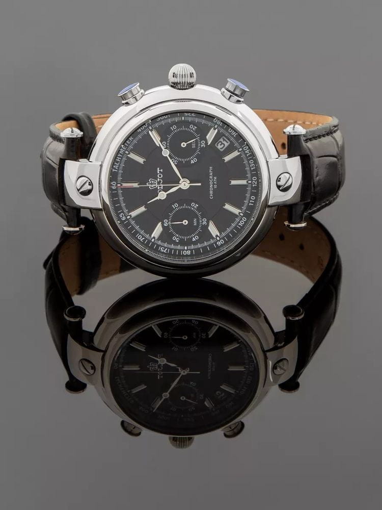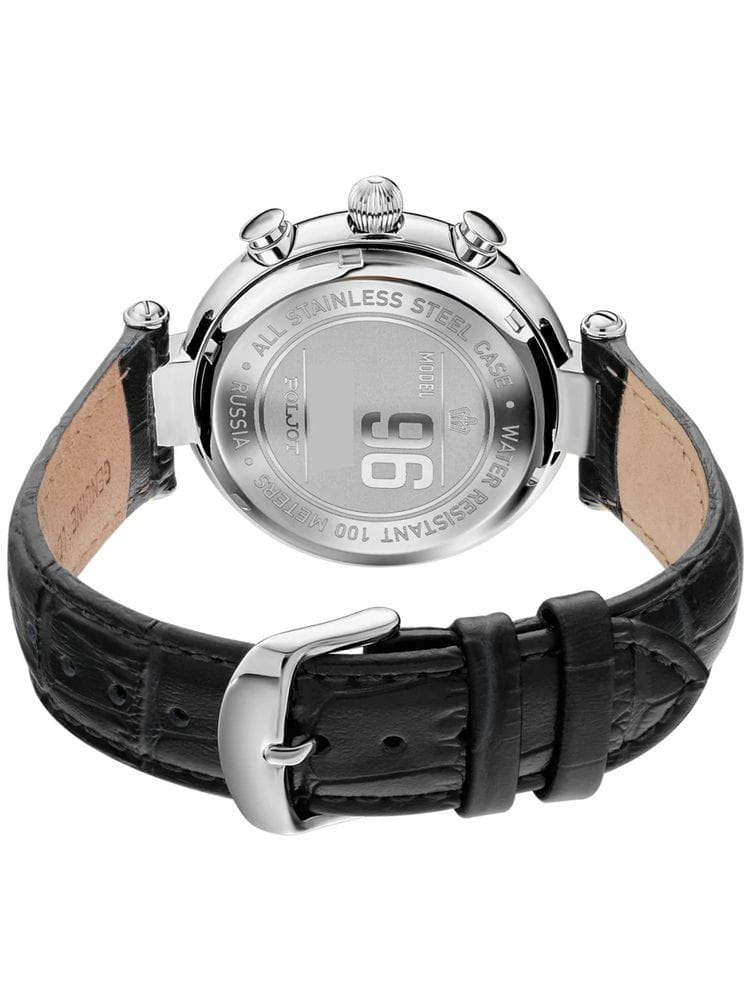 Poljot 6S21.961224 “Baikal” — элегантные кварцевые мужские часы, в которых классическая строгость сочетается с выразительным российским характером. Корпус из нержавеющей стали с крупными декоративными ушками придаёт модели солидность и узнаваемость, а глубокий чёрный циферблат с контрастными стрелками и индексами с люминесцентным покрытиемЛюминесцентное покрытиеПозволяет считывать показания времени в темноте. Производители наносят на стрелки, часовые индексы, безель или поверхность циферблата светонакопительный состав, дающий холодное свечение. подчёркивает точность и функциональность. Два дополнительных счётчика хронографаХронографФункция позволяет измерять отрезки времени с особой точностью: часы, минуты, секунды. Верным признаком хронографа является наличие на циферблате 3 дополнительных окошек-счётчиков. обеспечивают измерение времени с высокой точностью, а окно даты добавляет практичности. Прочное минеральное стеклоМинеральное стеклоМинеральное стекло представляет собой искусственно выращенный минерал кварца. Такое стекло отличается особой устойчивостью к повреждениям и царапинам. Уступает по некоторым качествам сапфировому стеклу. защищает циферблат от царапин, а ремешок из натуральной кожи с классической пряжкой гарантирует комфорт и надёжную фиксацию на запястье. Poljot “Baikal” — это сочетание традиций, надёжности и уверенного стиля, созданное для мужчин, ценящих точность и благородную сдержанность.