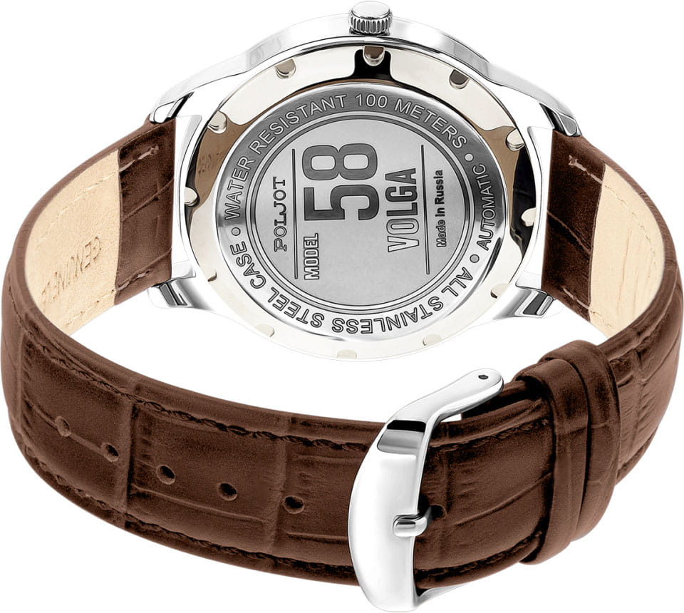 Poljot 8215.581020 — классические механические мужские часы с автоподзаводом, сочетающие традиции отечественного часового производства и лаконичный современный стиль. Корпус из нержавеющей стали подчёркивает надёжность и сдержанную элегантность модели, а глубокий циферблат с минималистичной разметкой, стрелки и метки с люминесцентным покрытиемЛюминесцентное покрытиеПозволяет считывать показания времени в темноте. Производители наносят на стрелки, часовые индексы, безель или поверхность циферблата светонакопительный состав, дающий холодное свечение., аккуратным окном даты и секундным акцентом придаёт образу динамичность. Механизм с автоподзаводом обеспечивает стабильную работу и плавный ход стрелок, подчёркивая инженерную точность исполнения. Прочное минеральное стеклоМинеральное стеклоМинеральное стекло представляет собой искусственно выращенный минерал кварца. Такое стекло отличается особой устойчивостью к повреждениям и царапинам. Уступает по некоторым качествам сапфировому стеклу. защищает циферблат, а ремешок из натуральной кожи с классической текстурой крокодила обеспечивает комфорт и благородный внешний вид. Poljot — воплощение надёжности, традиций и мужской элегантности, созданное для тех, кто ценит качество и уверенность в каждой детали.