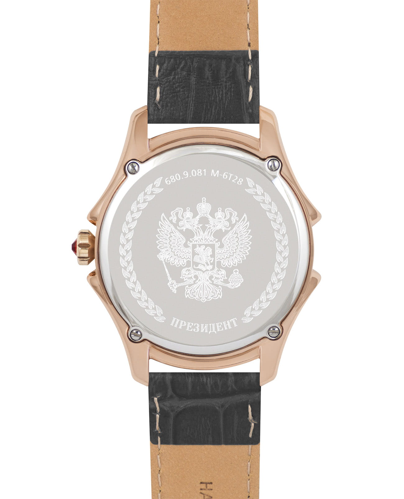 Стильные элегантные часы «Президент» — это идеальное дополнение к образу уверенной и целеустремлённой женщины. Модель выполнена в круглой форме с корпусом диаметром 39 мм и толщиной 11 мм, украшенным розовым золотом18-каратное золотоОбозначение по каратной системе пробирования, оно показывает, сколько драгоценного металла содержится в изделии. 18 карат - в составе 75% чистого золота, соответствует 750 пробе.