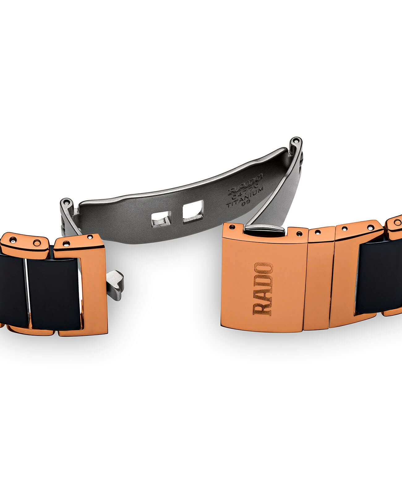 Наручным часам присущ роскошный стиль, изысканности добавляют 4 бриллианта в 0,026 карат, устоять перед их сиянием просто невозможно. Оригинальный браслет имеет высокопрочные вставки из высокотехнологичной керамикиВысокотехнологичная керамикаИнновационный запатентованный Rado материал с гладкой или матовой поверхностью. Керамика за счёт кристаллической структуры обладает повышенной устойчивостью от возникновения царапин. Материал способен принимать температуру тела человека, обеспечивая невероятный комфорт при ношении.. Модель комплектуется кварцевым механизмом ETA 976.001 с высокой точностью хода. Сапфировое стекло противостоит образованию царапин. Износоустойчивое PVD-покрытиеPVDУльтратонкое покрытие наносится в технике вакуумного напыления, сочетает в себе нитрид титана особой прочности со слоем золота или оксида хрома. Несёт в себе декоративную или защитную функцию.. Водостойкость 50 метров. Габариты: 22,7 x 33,1 x 6,5 мм.