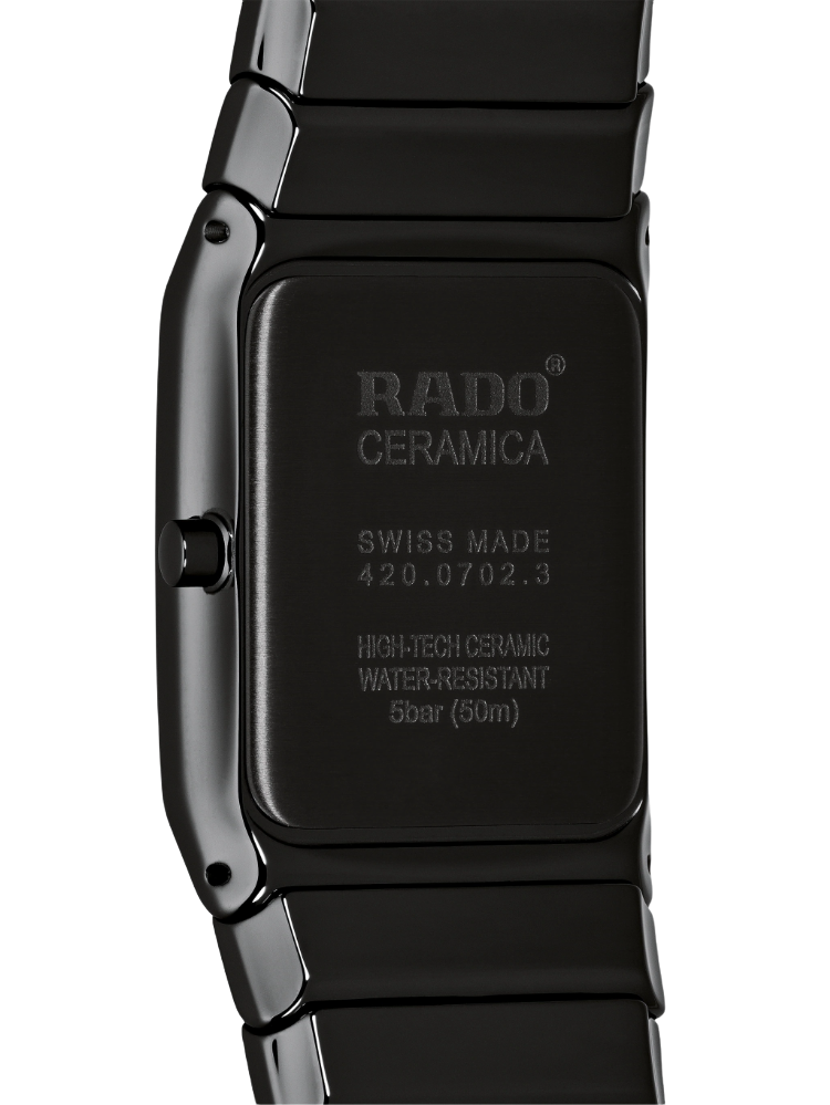 Чёрный прямоугольный циферблат с золотистыми стрелками находится в обрамлении надёжного керамического корпуса. В качестве украшения используются 4 бриллианта в 0,011 карат, драгоценные камни добавляют красоты и изящества. Чёткие геометрические формы. Кварцевый швейцарский механизм ETA 282.001 с высокой точностью хода. Использование высокотехнологичной керамикиВысокотехнологичная керамикаИнновационный запатентованный Rado материал с гладкой или матовой поверхностью. Керамика за счёт кристаллической структуры обладает повышенной устойчивостью от возникновения царапин. Материал способен принимать температуру тела человека, обеспечивая невероятный комфорт при ношении.. Стекло из сапфира. Водонепроницаемость при давлении 5 бар. Габариты: 31,7 x 22,9 x 6,6 мм.