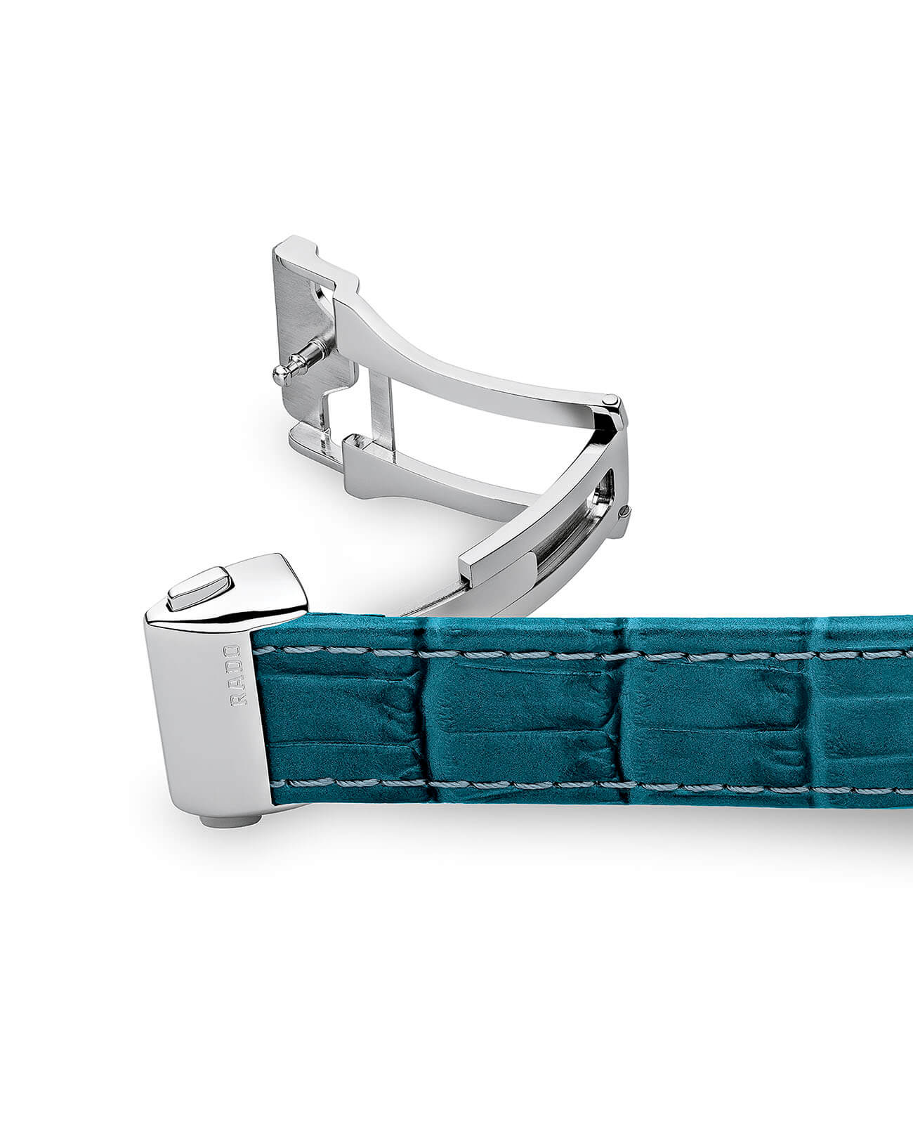 Аксессуар премиальной категории сразу бросается в глаза благодаря насыщенному бирюзовому исполнению. Отдельную привлекательность представляет собой узорчатый циферблат с перламутровой вставкой, декорированный 21 бриллиантами в 0,060 карат. Корпус и безель сделаны из плазменной керамикиВысокотехнологичная плазменная керамикаИнновационный материал, технология запатентована. Выплавление керамики осуществляется в печи при 20 000 °C, белоснежный материал под воздействием ультравысокой температуры приобретает уникальный блеск, присущий металлам., что обеспечивает максимально комфортное ношение. Кварцевый механизм ETA F05.841. Сапфировое стекло с антибликовой поверхностью. Задняя крышка с гравировкой. Кожаный ремешок из натурального материала. Миниатюрное окошко отображает фазы луны. Диаметр корпуса: 35 мм.