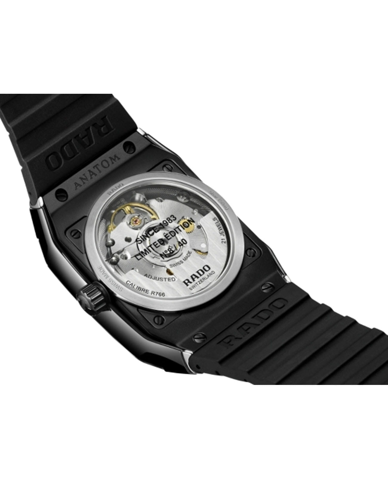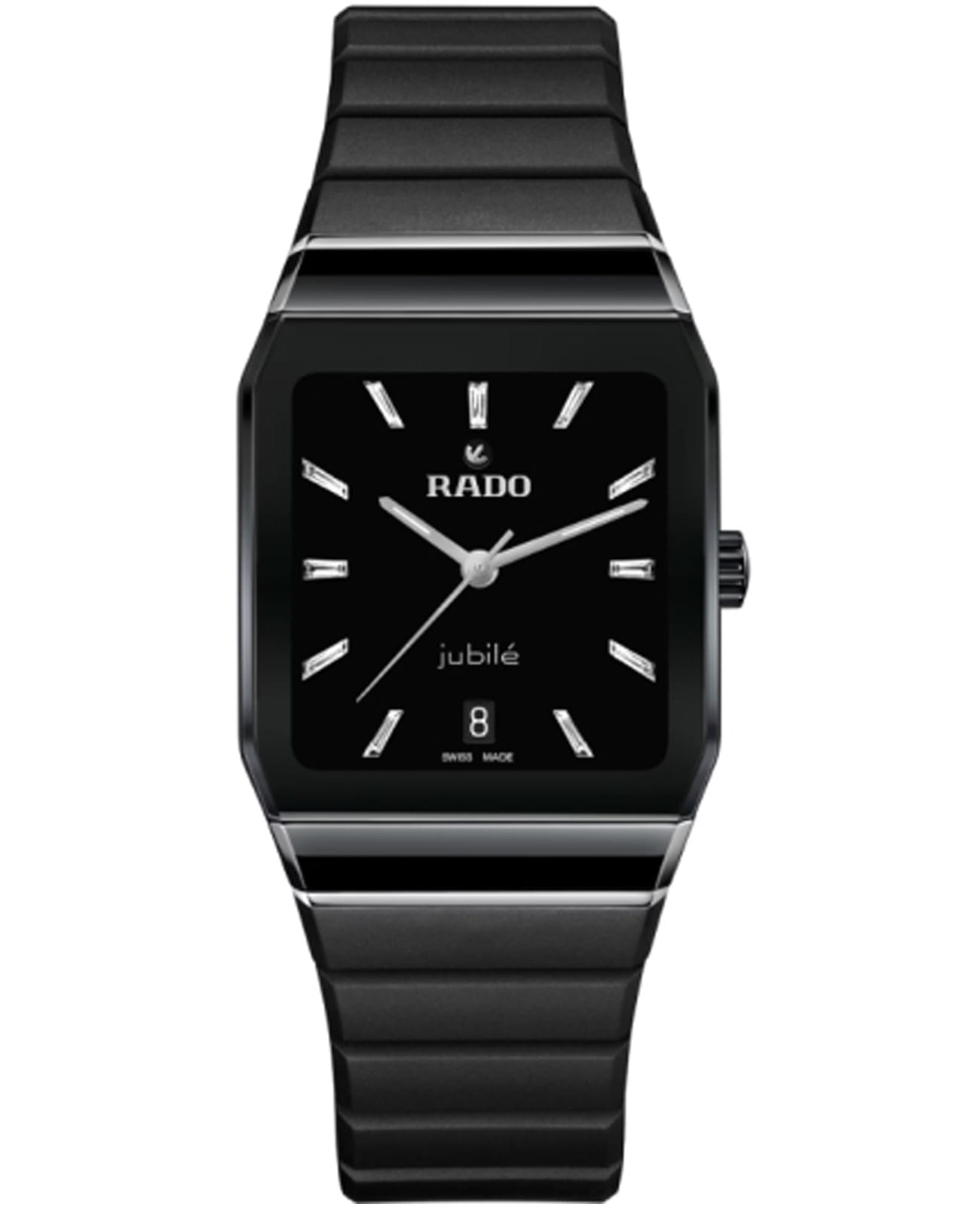 Мужские швейцарские механические часы Rado Anatom Automatic R10201739. Сапфировое стеклоСапфировое стеклоПрочный и надёжный материал из кристалла сапфира синтетического происхождения, характеризующийся особой твёрдостью и устойчивостью к царапинам и повреждениям. устойчивое к мелким механическим повреждениям. Корпус часов изготовлен из нержавеющей стали с PVD-покрытиемPVDУльтратонкое покрытие наносится в технике вакуумного напыления, сочетает в себе нитрид титана особой прочности со слоем золота или оксида хрома. Несёт в себе декоративную или защитную функцию. и керамики. Стрелки с люминесцентным покрытиемЛюминесцентное покрытиеПозволяет считывать показания времени в темноте. Производители наносят на стрелки, часовые индексы, безель или поверхность циферблата светонакопительный состав, дающий холодное свечение.. Циферблат украшен бриллиантами. Окошко даты находится в положении 6 часов. Класс водозащиты: 50 метров, позволит защитить корпус от случайных брызг или капель дождя. Каучковый ремешок на раскладной застёжкеРаскладная застёжкаТакой тип застёжки используется только на браслетах из металла. Она никогда не раскрывается полностью, происходит разделение на 2 и более частей. Раскладывающая застёжка снизит вероятность потери часов к минимуму..