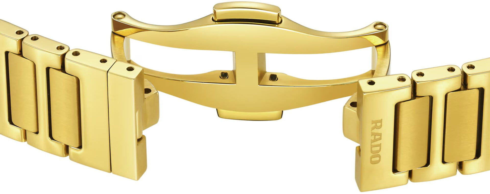 Женские механические часы с автоподзаводом Rado из коллекции Diastar Original — это элегантный аксессуар с классическим дизайном. Корпус овальной формы, диаметром 30 мм и толщиной 11 мм, выполнен из CeramosCeramosМатериал являет собой инновационное сочетание высокотехнологичной керамики и сплава металла. Он объединяет керамическую устойчивость к царапинам и металлический роскошный блеск. с PVD-покрытиемPVDУльтратонкое покрытие наносится в технике вакуумного напыления, сочетает в себе нитрид титана особой прочности со слоем золота или оксида хрома. Несёт в себе декоративную или защитную функцию. золотого цвета. Неподвижный безельБезельВнешний ободок, закрепляющий стекло. В спортивных часах так называется поворотное кольцо с делениями на циферблате, выполняет роль таймера – замеряет отрезки времени на шкале. Неподвижный безель – элемент декора. Однонаправленно вращающийся безель на дайверских часах позволяет фиксировать моменты погружения и выныривания на поверхность. также изготовлен из Ceramos. Циферблат жёлтого цвета оформлен без индексов, с золотистыми стрелками. Циферблат защищён сапфировым стекломСапфировое стеклоПрочный и надёжный материал из кристалла сапфира синтетического происхождения, характеризующийся особой твёрдостью и устойчивостью к царапинам и повреждениям. с антибликовым покрытиемАнтибликовое покрытиеСлой оксида металла в 0,13-0,3 микрон, благодаря которому стекло часов не бликует и не отражает свет. Антибликовое покрытие уменьшает отражение света в 10 раз, обеспечивая отличную читаемость показателей циферблата. на внутренней стороне. Стрелки с люминесцентным покрытиемЛюминесцентное покрытиеПозволяет считывать показания времени в темноте. Производители наносят на стрелки, часовые индексы, безель или поверхность циферблата светонакопительный состав, дающий холодное свечение. Super-Luminova®, обеспечивающим хорошую читаемость в темноте. Механизм — автоматический калибр R586 с запасом хода 48 часов, частотой 28 800 полуколебаний в час и 25 камнями. Окошко даты расположено в положении 6 часов. Часы оснащены стальным браслетом с застёжкой «бабочка» с кнопкамиЗастёжка "бабочка"Такой вид застёжки дополняется предохранителями, помогающими избежать случайного раскрытия браслета. Обладают изящным исполнением. . Водонепроницаемость 100 м позволяет использовать часы для плавания. Гарантия — 5 лет на механизм, 2 года на изделие. Идеальный выбор для тех, кто ценит стиль, точность и швейцарское качество.