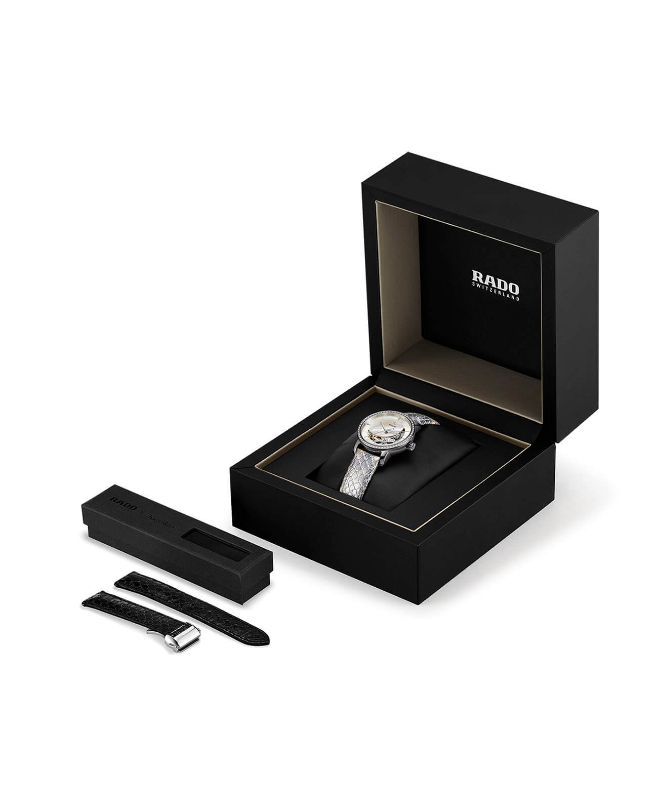 Дизайн модели является действительно роскошным - светлый циферблат дополнен двумя окружностями, декорированными сияющими драгоценными камнями. Безель украшен 60 бриллиантами, а скелетонизированное отверстие, сквозь которое просматривается движение деталей механизма, инкрустировано 5 бриллиантами в 0,004 и 0,002 карат. Часы оснащены автоматическим калибром ETA C07.631 с увеличенным резервом хода до 80 часов. Сапфировое стекло с антибликовой обработкой. Корпус из плазменной керамики