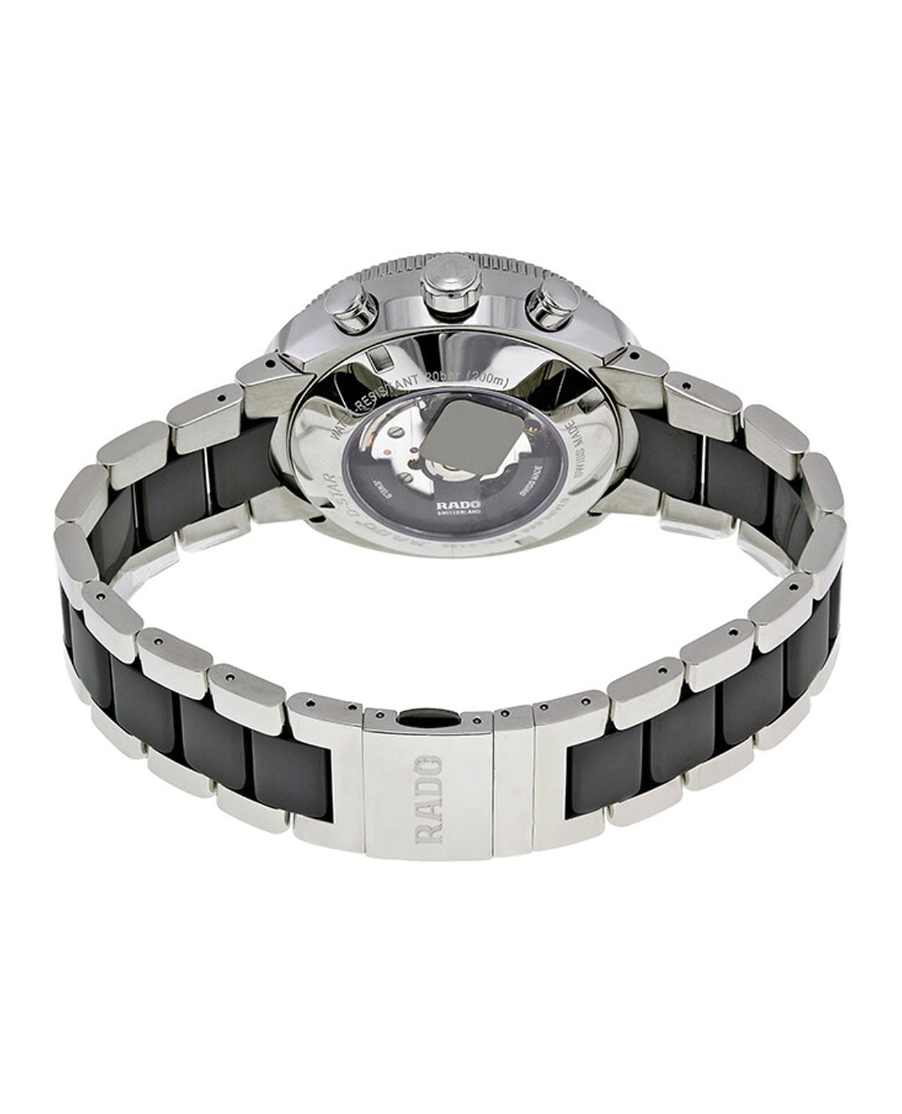 Мужские механические швейцарские часы-хронографХронографФункция позволяет измерять отрезки времени с особой точностью: часы, минуты, секунды. Верным признаком хронографа является наличие на циферблате 3 дополнительных окошек-счётчиков. с автоподзаводом Rado D-Star R15965152. Сапфировое стеклоСапфировое стеклоПрочный и надёжный материал из кристалла сапфира синтетического происхождения, характеризующийся особой твёрдостью и устойчивостью к царапинам и повреждениям. устойчивое к мелким механическим повреждениям. Корпус часов изготовлен из нержавеющей стали. БезельБезельВнешний ободок, закрепляющий стекло. В спортивных часах так называется поворотное кольцо с делениями на циферблате, выполняет роль таймера – замеряет отрезки времени на шкале. Неподвижный безель – элемент декора. Однонаправленно вращающийся безель на дайверских часах позволяет фиксировать моменты погружения и выныривания на поверхность. из нержавеющей стали и высокотехнологичной керамикиВысокотехнологичная керамикаИнновационный запатентованный Rado материал с гладкой или матовой поверхностью. Керамика за счёт кристаллической структуры обладает повышенной устойчивостью от возникновения царапин. Материал способен принимать температуру тела человека, обеспечивая невероятный комфорт при ношении.. Окошко даты находится в положении 6 часов. Стрелки с люминесцентным покрытиемЛюминесцентное покрытиеПозволяет считывать показания времени в темноте. Производители наносят на стрелки, часовые индексы, безель или поверхность циферблата светонакопительный состав, дающий холодное свечение.. Класс водозащиты: 200 метров, позволит плавать, нырять и заниматься другими водными видами спорта. Браслет из стали и высокотехнологичной керамикиВысокотехнологичная керамикаИнновационный запатентованный Rado материал с гладкой или матовой поверхностью. Керамика за счёт кристаллической структуры обладает повышенной устойчивостью от возникновения царапин. Материал способен принимать температуру тела человека, обеспечивая невероятный комфорт при ношении. на раскладной застёжкеРаскладная застёжкаТакой тип застёжки используется только на браслетах из металла. Она никогда не раскрывается полностью, происходит разделение на 2 и более частей. Раскладывающая застёжка снизит вероятность потери часов к минимуму..