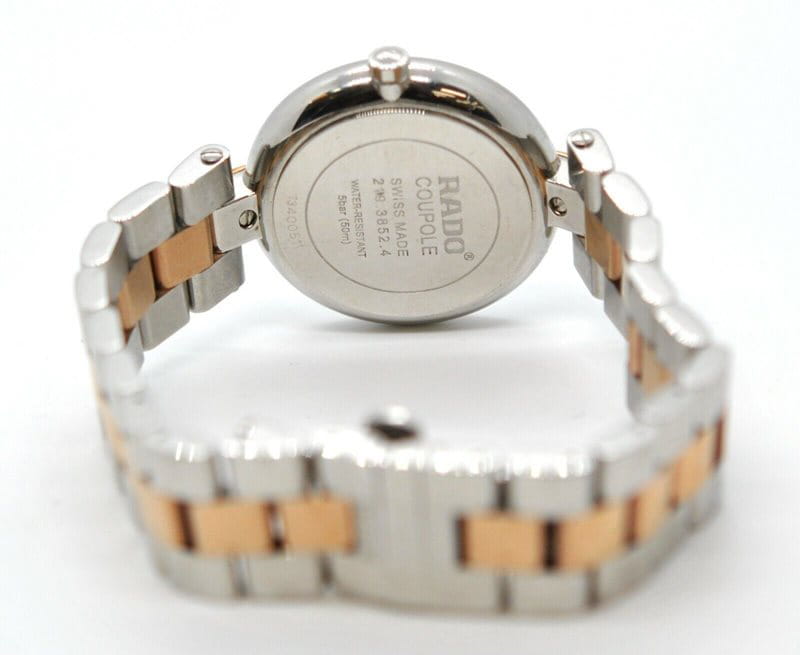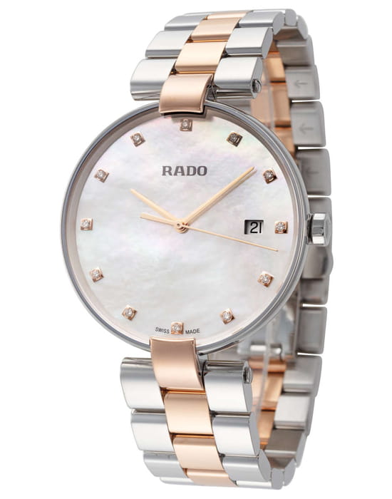 Швейцарские женские часы Rado Coupole R22852923, кварцевый механизм с высокой точностью. Сапфировое стеклоСапфировое стеклоПрочный и надёжный материал из кристалла сапфира синтетического происхождения, характеризующийся особой твёрдостью и устойчивостью к царапинам и повреждениям. устойчивое к появлению царапин, обладающее высокой прозрачностью. Корпус часов изготовлен из нержавеющей стали. Окошко даты находится в положении 3 часа. Класс водозащиты: 50 метров, позволит защитить корпус от случайных брызг или капель дождя. Стальной браслет с частичным PVD-покрытиемPVDУльтратонкое покрытие наносится в технике вакуумного напыления, сочетает в себе нитрид титана особой прочности со слоем золота или оксида хрома. Несёт в себе декоративную или защитную функцию. на застёжке-бабочке с кнопкамиЗастёжка "бабочка"Такой вид застёжки дополняется предохранителями, помогающими избежать случайного раскрытия браслета. Обладают изящным исполнением. .