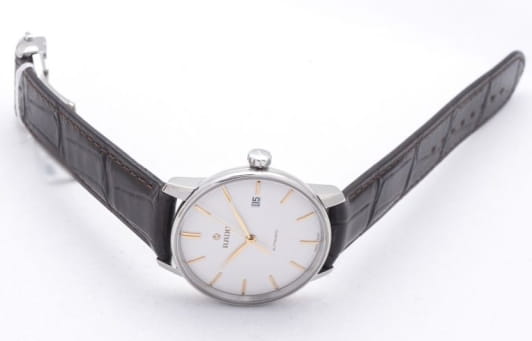 Мужские швейцарские механические часы с автоподзаводом Rado Coupole R22860025. Корпус часов изготовлен из нержавеющей стали. Сапфировое стеклоСапфировое стеклоПрочный и надёжный материал из кристалла сапфира синтетического происхождения, характеризующийся особой твёрдостью и устойчивостью к царапинам и повреждениям. устойчивое к мелким механическим повреждениям. Кожаный ремешок с раскладной застёжкойРаскладная застёжкаТакой тип застёжки используется только на браслетах из металла. Она никогда не раскрывается полностью, происходит разделение на 2 и более частей. Раскладывающая застёжка снизит вероятность потери часов к минимуму.. Класс водозащиты: 50 метров, позволит защитить корпус от случайных брызг или капель дождя. Окошко даты находится в положении 3 часа.