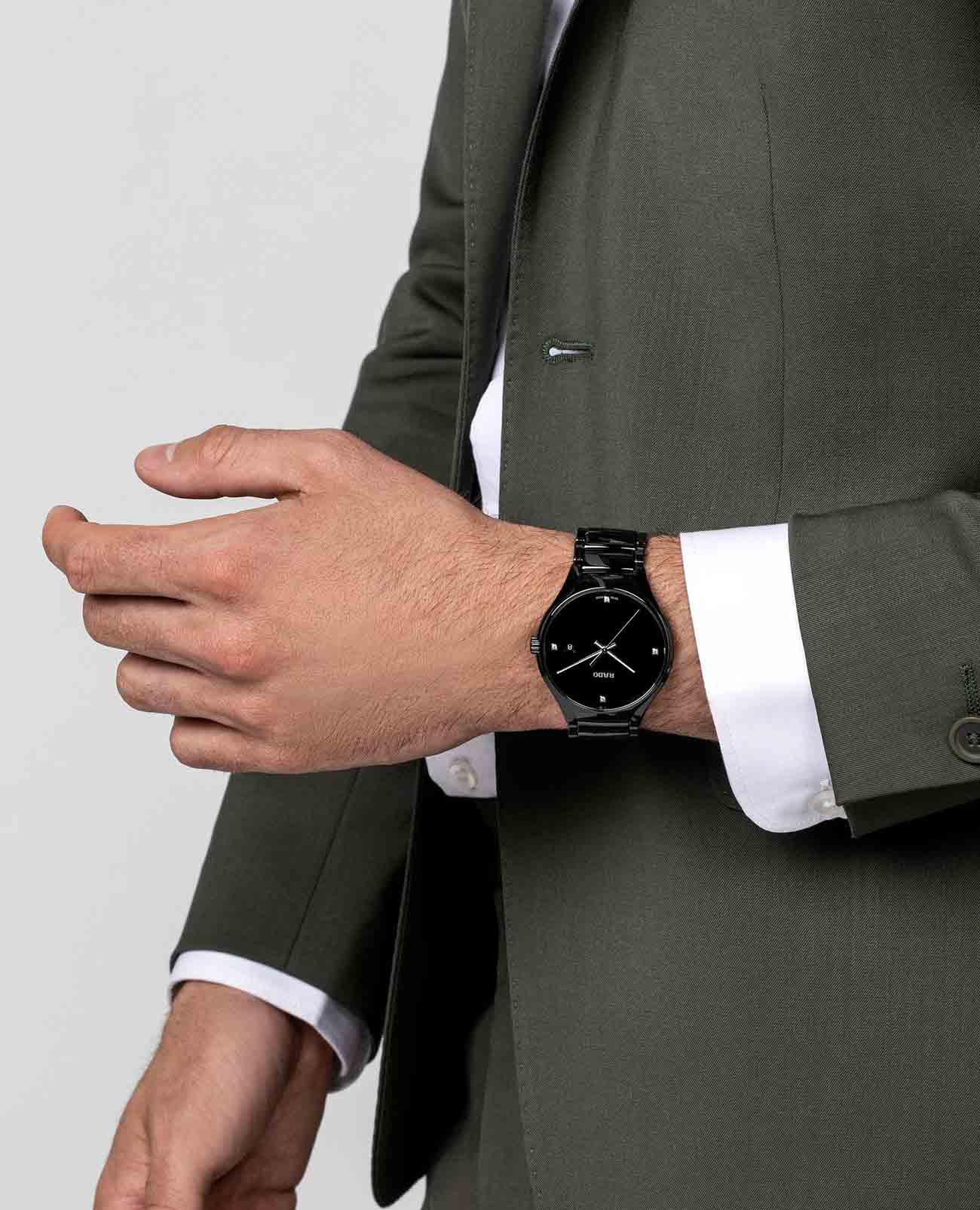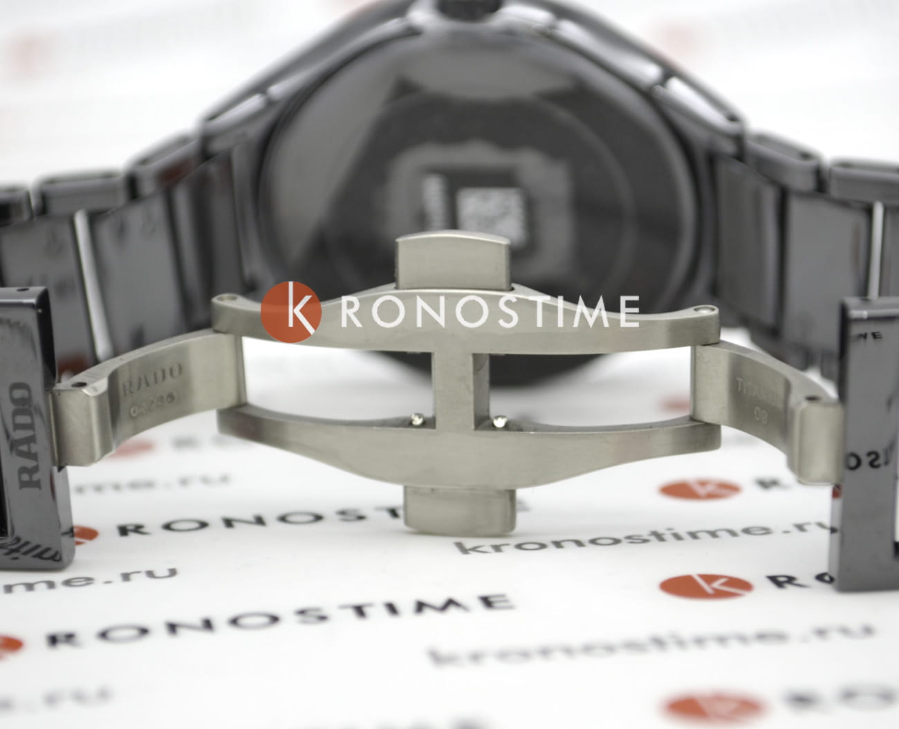 Браслет часов выполнен из титана и высокотехнологичной керамикиВысокотехнологичная керамикаИнновационный запатентованный Rado материал с гладкой или матовой поверхностью. Керамика за счёт кристаллической структуры обладает повышенной устойчивостью от возникновения царапин. Материал способен принимать температуру тела человека, обеспечивая невероятный комфорт при ношении., что придаёт им дополнительную прочность и комфорт при ношении. Застёжка выполнена в виде «бабочки»Застёжка "бабочка"Такой вид застёжки дополняется предохранителями, помогающими избежать случайного раскрытия браслета. Обладают изящным исполнением. , что обеспечивает удобную и надёжную фиксацию на запястье.