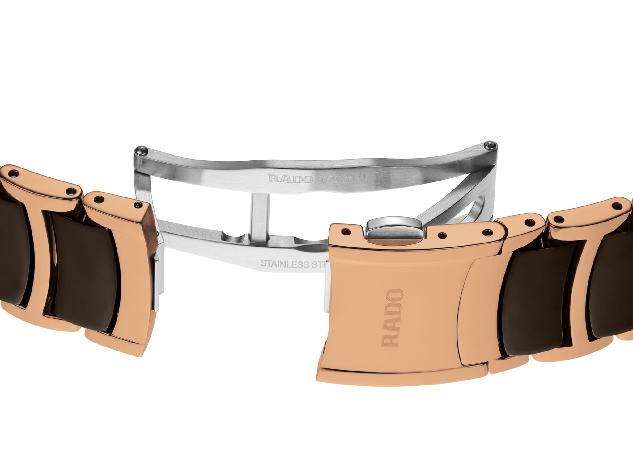 Швейцарские часы с надёжным кварцевым механизмом Rado Centrix Diamonds R30023712. Корпус часов изготовлен из нержавеющей стали. Браслет из стали и высокотехнологичной керамикиВысокотехнологичная керамикаИнновационный запатентованный Rado материал с гладкой или матовой поверхностью. Керамика за счёт кристаллической структуры обладает повышенной устойчивостью от возникновения царапин. Материал способен принимать температуру тела человека, обеспечивая невероятный комфорт при ношении. на раскладной застёжкеРаскладная застёжкаТакой тип застёжки используется только на браслетах из металла. Она никогда не раскрывается полностью, происходит разделение на 2 и более частей. Раскладывающая застёжка снизит вероятность потери часов к минимуму.. Сапфировое стеклоСапфировое стеклоПрочный и надёжный материал из кристалла сапфира синтетического происхождения, характеризующийся особой твёрдостью и устойчивостью к царапинам и повреждениям. устойчивое к мелким механическим повреждениям. Класс водозащиты: 50 метров, позволит защитить корпус от случайных брызг или капель дождя. Окошко даты находится в положении 6 часов. Циферблат инкрустирован бриллантами.