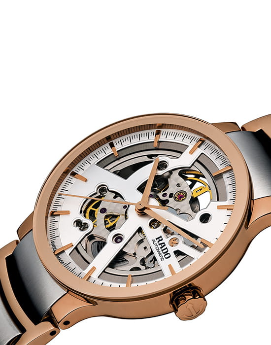 Часы-скелетоны станут главным атрибутом в создании индивидуального образа, оригинальная модель точно станет объектом притяжения окружающих. Внутри корпуса из нержавеющей стали заключён автоматический калибр ETA C07.631 с запасом хода 80 часов. Стальной браслет имеет вставки из высокотехнологичной керамикиВысокотехнологичная керамикаИнновационный запатентованный Rado материал с гладкой или матовой поверхностью. Керамика за счёт кристаллической структуры обладает повышенной устойчивостью от возникновения царапин. Материал способен принимать температуру тела человека, обеспечивая невероятный комфорт при ношении.. Стекло из сапфира устойчиво к образованию царапин. Водостойкость 3 бар. Диаметр корпуса: 38 мм.