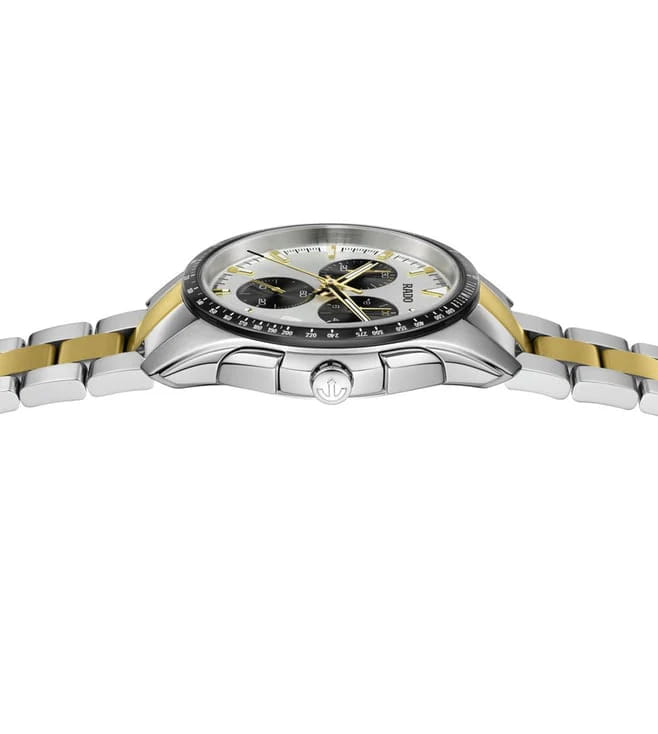 Мужские наручные часы-хронографХронографФункция позволяет измерять отрезки времени с особой точностью: часы, минуты, секунды. Верным признаком хронографа является наличие на циферблате 3 дополнительных окошек-счётчиков. Rado Hyperchrome Chronograph. Корпус часов изготовлен из нержавеющей стали. БезельБезельВнешний ободок, закрепляющий стекло. В спортивных часах так называется поворотное кольцо с делениями на циферблате, выполняет роль таймера – замеряет отрезки времени на шкале. Неподвижный безель – элемент декора. Однонаправленно вращающийся безель на дайверских часах позволяет фиксировать моменты погружения и выныривания на поверхность. из нержавеющей стали с PVD-покрытиемPVDУльтратонкое покрытие наносится в технике вакуумного напыления, сочетает в себе нитрид титана особой прочности со слоем золота или оксида хрома. Несёт в себе декоративную или защитную функцию.. Стальной браслет с частичным PVD-покрытиемPVDУльтратонкое покрытие наносится в технике вакуумного напыления, сочетает в себе нитрид титана особой прочности со слоем золота или оксида хрома. Несёт в себе декоративную или защитную функцию. на застёжке «бабочка» с кнопкамиЗастёжка "бабочка"Такой вид застёжки дополняется предохранителями, помогающими избежать случайного раскрытия браслета. Обладают изящным исполнением. . БезельБезельВнешний ободок, закрепляющий стекло. В спортивных часах так называется поворотное кольцо с делениями на циферблате, выполняет роль таймера – замеряет отрезки времени на шкале. Неподвижный безель – элемент декора. Однонаправленно вращающийся безель на дайверских часах позволяет фиксировать моменты погружения и выныривания на поверхность. со шкалой тахиметраТахиметрРазмеченная шкала, располагается на ободке или безеле часов. Тахиметр позволяет рассчитать скорость на определённом участке пути, расстояние измеряется в километрах или милях.. Окошко даты находится в положении 4 часа. Стрелки и метки с люминесцентным покрытиемЛюминесцентное покрытиеПозволяет считывать показания времени в темноте. Производители наносят на стрелки, часовые индексы, безель или поверхность циферблата светонакопительный состав, дающий холодное свечение.. Сапфировое стеклоСапфировое стеклоПрочный и надёжный материал из кристалла сапфира синтетического происхождения, характеризующийся особой твёрдостью и устойчивостью к царапинам и повреждениям. с антибликовым покрытиемАнтибликовое покрытиеСлой оксида металла в 0,13-0,3 микрон, благодаря которому стекло часов не бликует и не отражает свет. Антибликовое покрытие уменьшает отражение света в 10 раз, обеспечивая отличную читаемость показателей циферблата. устойчивое к мелким механическим повреждениям. Класс водозащиты: 100 метров, позволит плавать, нырять и заниматься другими водными видами спорта.