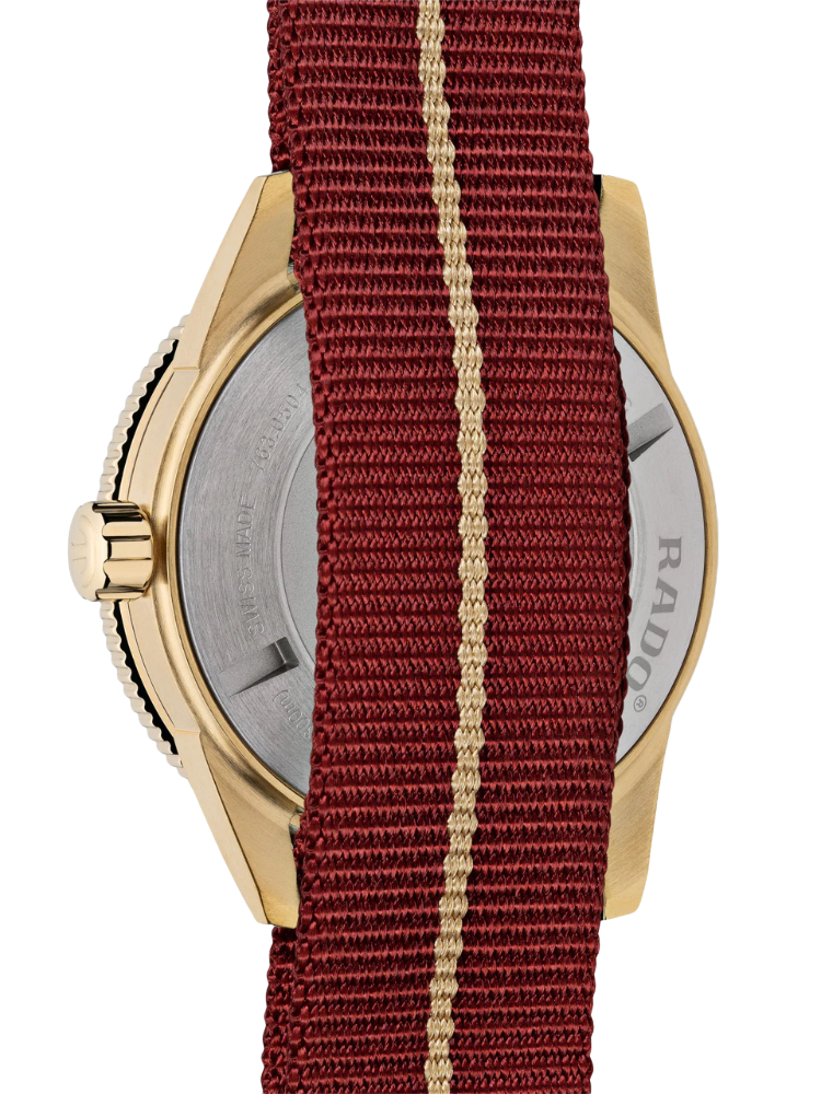 Часы выполнены в классическом дизайне, модель останется актуальной на долгие годы. Красный циферблат «солнечные лучи» дополнен контрастными цифрами. Премиальный аксессуар имеет роскошный корпус – он выполнен из бронзы и высокотехнологичной керамикиВысокотехнологичная керамикаИнновационный запатентованный Rado материал с гладкой или матовой поверхностью. Керамика за счёт кристаллической структуры обладает повышенной устойчивостью от возникновения царапин. Материал способен принимать температуру тела человека, обеспечивая невероятный комфорт при ношении.. Безупречную точность хода регулирует швейцарский автоматический калибр ETA C07.611 с запасом хода до 80 часов. Антибликовое покрытие сапфирового стекла улучшает читаемость показаний. Стрелки и метки дополнены люминесцентным покрытиемЛюминесцентное покрытиеПозволяет считывать показания времени в темноте. Производители наносят на стрелки, часовые индексы, безель или поверхность циферблата светонакопительный состав, дающий холодное свечение.. Закручивающаяся задняя крышка и завинчивающаяся заводная головка усиливают водостойкость модели до 30 бар. На метке 3 часов расположена апертура даты. Диаметр корпуса: 42 мм.