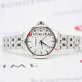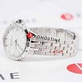 Циферблат серебристого цвета украшен часовыми метками и стрелками с люминесцентным покрытиемЛюминесцентное покрытиеПозволяет считывать показания времени в темноте. Производители наносят на стрелки, часовые индексы, безель или поверхность циферблата светонакопительный состав, дающий холодное свечение., что обеспечивает удобство чтения времени даже при низкой освещённости. Окошко даты расположено на отметке «3 часа» для дополнительного удобства.