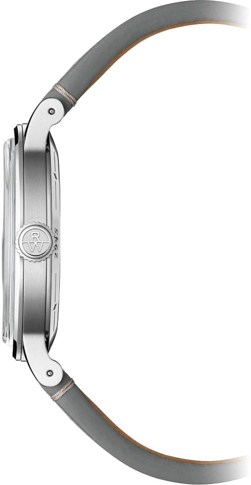 Прозрачная задняя крышка с сапфировым стекломСапфировое стеклоПрочный и надёжный материал из кристалла сапфира синтетического происхождения, характеризующийся особой твёрдостью и устойчивостью к царапинам и повреждениям.. Рифленая заводная головка с логотипом RW.