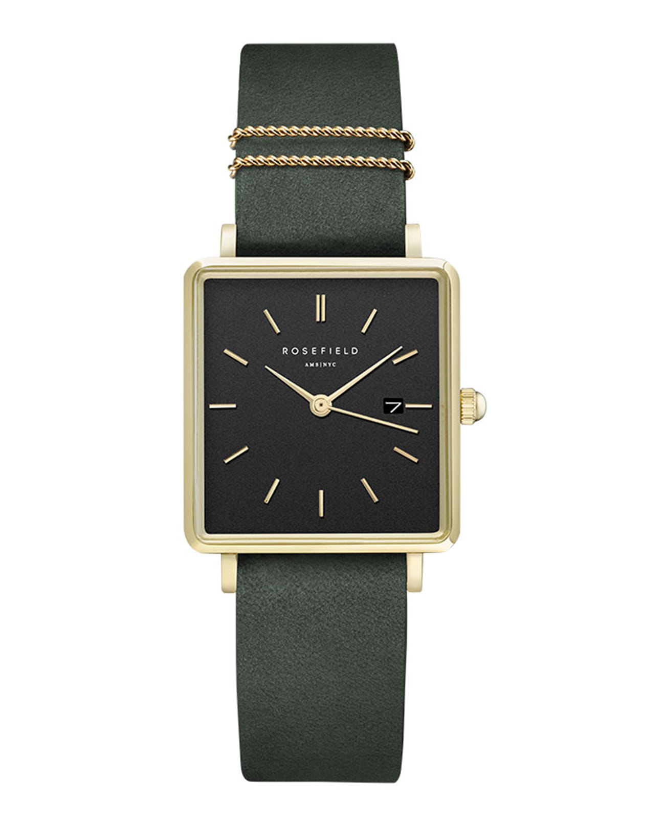 Женские кварцевые часы. Центральные часовая, минутная и секундная стрелки. Апертура даты в позиции 3 часов. Черный циферблат. Корпус выполнен из полированной нержавеющей стали с IP покрытием цвета желтого золота. Размер корпуса составляет 26х28 мм, толщина 7 мм. Кожаный ремешок темно-зеленого цвета шириной 16 мм, стандартная застежка. Прочное минеральное стекло устойчивое к мелким механическим повреждениям. Водостойкость WR 30 (брызги). В комплекте стальной браслет с IP покрытием цвета желтого золота выполненный в технике миланского плетения.