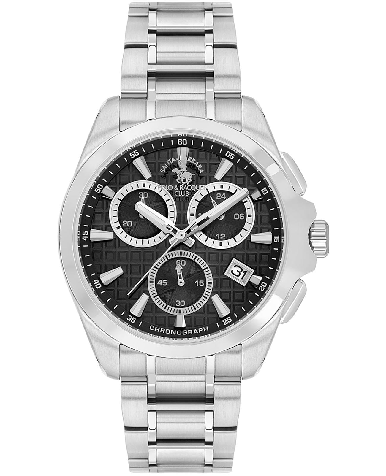 Мужские кварцевые часы-хронографХронографФункция позволяет измерять отрезки времени с особой точностью: часы, минуты, секунды. Верным признаком хронографа является наличие на циферблате 3 дополнительных окошек-счётчиков. с секундомеромСекундомерСекундоме́р — прибор, способный измерять интервалы времени с точностью до долей секунды. Santa Barbara Polo & Racquet Club SB.1.10591-2 — воплощение элегантности и технического совершенства. Корпус из нержавеющей стали серебристого цвета, диаметром 43 мм, что делает их устойчивыми к внешним воздействиям и придает благородный вид. Стрелки и метки с люминесцентным покрытиемЛюминесцентное покрытиеПозволяет считывать показания времени в темноте. Производители наносят на стрелки, часовые индексы, безель или поверхность циферблата светонакопительный состав, дающий холодное свечение., обеспечивающим хорошую читаемость в темноте. Циферблат защищён минеральным стекломМинеральное стеклоМинеральное стекло представляет собой искусственно выращенный минерал кварца. Такое стекло отличается особой устойчивостью к повреждениям и царапинам. Уступает по некоторым качествам сапфировому стеклу. устойчивое к царапинам и механическим повреждениям. 12-ти и 24-х часовой формат времени. Окошко даты находится в положении 4 часа. Фактурный циферблат с квадратными ячейками, украшен фирменным логотипом. Накладные метки в виде штрихов. Стальной браслет на раскладной застёжке с фиксаторомРаскладная застёжкаТакой тип застёжки используется только на браслетах из металла. Она никогда не раскрывается полностью, происходит разделение на 2 и более частей. Раскладывающая застёжка снизит вероятность потери часов к минимуму. обеспечивает комфортное и безопасное ношение. Водонепроницаемость 50 метров позволит защитить корпус от случайных брызг или капель дождя. Идеальный выбор для тех, кто ценит элегантный дизайн и качество.