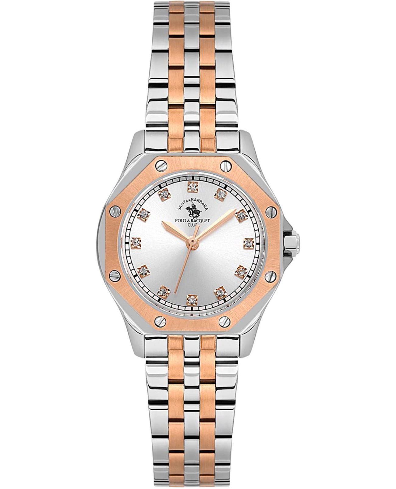Женские кварцевые часы Santa Barbara Polo & Racquet Club — это изысканный и стильный аксессуар. Корпус диаметром 27 мм выполнен из стали 316L. БезельБезельВнешний ободок, закрепляющий стекло. В спортивных часах так называется поворотное кольцо с делениями на циферблате, выполняет роль таймера – замеряет отрезки времени на шкале. Неподвижный безель – элемент декора. Однонаправленно вращающийся безель на дайверских часах позволяет фиксировать моменты погружения и выныривания на поверхность. с частичным IP-покрытиемIP-покрытиеМетод ионного напыления. Демонстрирует повышенную устойчивость к истиранию, окислению и химическим веществам. Под воздействием высокого давления и температуры около 1500°C молекулы металла надёжно соединяются с частицами корпуса часов. накладной, с матовой обработкой и декоративными болтами. Циферблат серебристого цвета выполнен по технологии Sunray («солнечные лучи») и оформлен точками, инкрустированными кристаллами, и мечевидными стрелками в стиле Sword. Циферблат защищён минеральным стекломМинеральное стеклоМинеральное стекло представляет собой искусственно выращенный минерал кварца. Такое стекло отличается особой устойчивостью к повреждениям и царапинам. Уступает по некоторым качествам сапфировому стеклу.. Механизм — японское кварцевое движение калибра Seiko TMI VJ21C1. Заводная головка выполнена в форме болта с защитой. Часы оснащены стальным браслетом с частичным IP-покрытиемIP-покрытиеМетод ионного напыления. Демонстрирует повышенную устойчивость к истиранию, окислению и химическим веществам. Под воздействием высокого давления и температуры около 1500°C молекулы металла надёжно соединяются с частицами корпуса часов. на застёжке «бабочка» с кнопкамиЗастёжка "бабочка"Такой вид застёжки дополняется предохранителями, помогающими избежать случайного раскрытия браслета. Обладают изящным исполнением. . Водонепроницаемость 50 м позволяет использовать часы в повседневных условиях. Идеальный выбор для тех, кто ценит американское качество и современный дизайн.