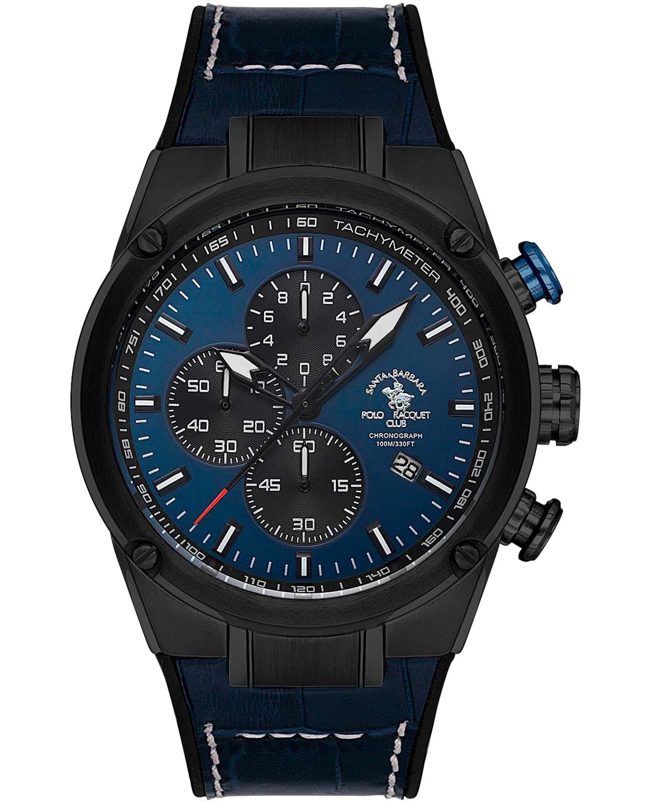 Мужские кварцевые часы-хронографХронографФункция позволяет измерять отрезки времени с особой точностью: часы, минуты, секунды. Верным признаком хронографа является наличие на циферблате 3 дополнительных окошек-счётчиков. с секундомеромСекундомерСекундоме́р — прибор, способный измерять интервалы времени с точностью до долей секунды. Santa Barbara Polo & Racquet Club SB.3.10001-3 — воплощение элегантности и технического совершенства. Корпус из нержавеющей стали с IP-покрытиемIP-покрытиеМетод ионного напыления. Демонстрирует повышенную устойчивость к истиранию, окислению и химическим веществам. Под воздействием высокого давления и температуры около 1500°C молекулы металла надёжно соединяются с частицами корпуса часов. черного цвета, диаметром 45 мм, что делает их устойчивыми к внешним воздействиям и придает благородный вид. Стрелки и метки с люминесцентным покрытиемЛюминесцентное покрытиеПозволяет считывать показания времени в темноте. Производители наносят на стрелки, часовые индексы, безель или поверхность циферблата светонакопительный состав, дающий холодное свечение., обеспечивающим хорошую читаемость в темноте. Циферблат защищён минеральным стекломМинеральное стеклоМинеральное стекло представляет собой искусственно выращенный минерал кварца. Такое стекло отличается особой устойчивостью к повреждениям и царапинам. Уступает по некоторым качествам сапфировому стеклу. устойчивое к царапинам и механическим повреждениям. Окошко даты находится в положении 4 часа, тахиметрТахиметрРазмеченная шкала, располагается на ободке или безеле часов. Тахиметр позволяет рассчитать скорость на определённом участке пути, расстояние измеряется в километрах или милях. по внешнему краю. Кожаный ремешок на стандартной застёжке обеспечивает комфортное и безопасное ношение. Водонепроницаемость 100 метров позволит плавать, нырять и заниматься другими водными видами спорта. Идеальный выбор для тех, кто ценит элегантный дизайн и качество.
