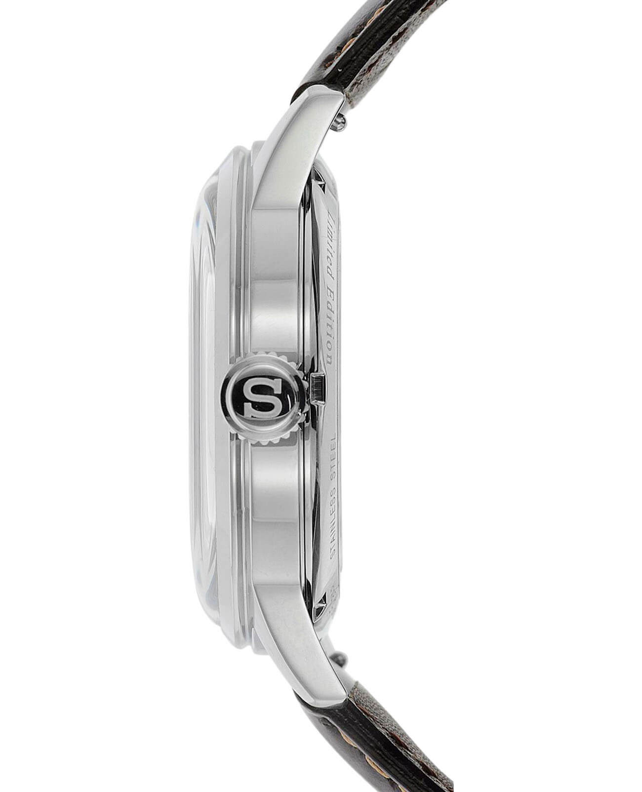 Модель выпускается ограниченным тиражом, всего существует 6000 экземпляров. Циферблат привлекает лаконичным узором, крупная индикация времени обеспечивает идеальную читаемость данных. На позиции 9 часов размещено круглое окошко, позволяющее прикоснуться к миру часового искусства. Это часы с автоподзаводом, работа японского автоматического механизма Seiko 4R38 просматривается сквозь завинчивающуюся прозрачную заднюю крышку. Запас хода – 40 часов, функция «stop-second» позволяет остановить часовой механизм для настройки времени с точностью до секунды. Ремешок выполнен из натуральной кожи. Циферблат защищён ультрапрочным минеральным стеклом Hardlex. Диаметр корпуса: 40,5 мм.