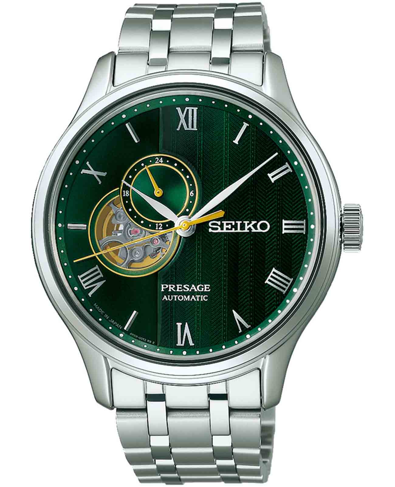 Модель Seiko SSA463J1 из коллекции Presage Japanese Garden — это элегантные автоматические часы, вдохновлённые эстетикой японских садов и философией дзен. Корпус диаметром 41,8 мм выполнен из нержавеющей стали с комбинированной полировкой и прозрачной задней крышкой. Водозащита составляет 30 метров — оптимально для повседневной носки. Фиксированный стальной безельБезельВнешний ободок, закрепляющий стекло. В спортивных часах так называется поворотное кольцо с делениями на циферблате, выполняет роль таймера – замеряет отрезки времени на шкале. Неподвижный безель – элемент декора. Однонаправленно вращающийся безель на дайверских часах позволяет фиксировать моменты погружения и выныривания на поверхность. подчёркивает гармоничные формы корпуса. Циферблат насыщенного зелёного цвета с тонкой текстурой напоминает волны гравия в японском саду. Открытое окно «open heart» на 9 часах позволяет наблюдать за работой механизма. В верхней части расположен индикатор запаса ходаШагомерШагоме́р или педо́метр — измерительный прибор для подсчёта количества сделанных шагов (или пар шагов) при ходьбе или беге.. Циферблат защищён двойным выпуклым сапфировым стекломСапфировое стеклоПрочный и надёжный материал из кристалла сапфира синтетического происхождения, характеризующийся особой твёрдостью и устойчивостью к царапинам и повреждениям. с внутренним антибликовым покрытиемАнтибликовое покрытиеСлой оксида металла в 0,13-0,3 микрон, благодаря которому стекло часов не бликует и не отражает свет. Антибликовое покрытие уменьшает отражение света в 10 раз, обеспечивая отличную читаемость показателей циферблата., устойчивым к царапинам и бликам. Внутри установлен автоматический калибр Seiko 4R39 с ручным подзаводом, функцией остановки секундной стрелки и запасом хода до 41 часа. Браслет выполнен из нержавеющей стали и оснащён удобной застёжкой «бабочка» с кнопкамиЗастёжка "бабочка"Такой вид застёжки дополняется предохранителями, помогающими избежать случайного раскрытия браслета. Обладают изящным исполнением. . Seiko SARY237 — это стильное и сбалансированное решение для ценителей классики с японским характером, где сочетаются глубокий дизайн и надёжная механика.