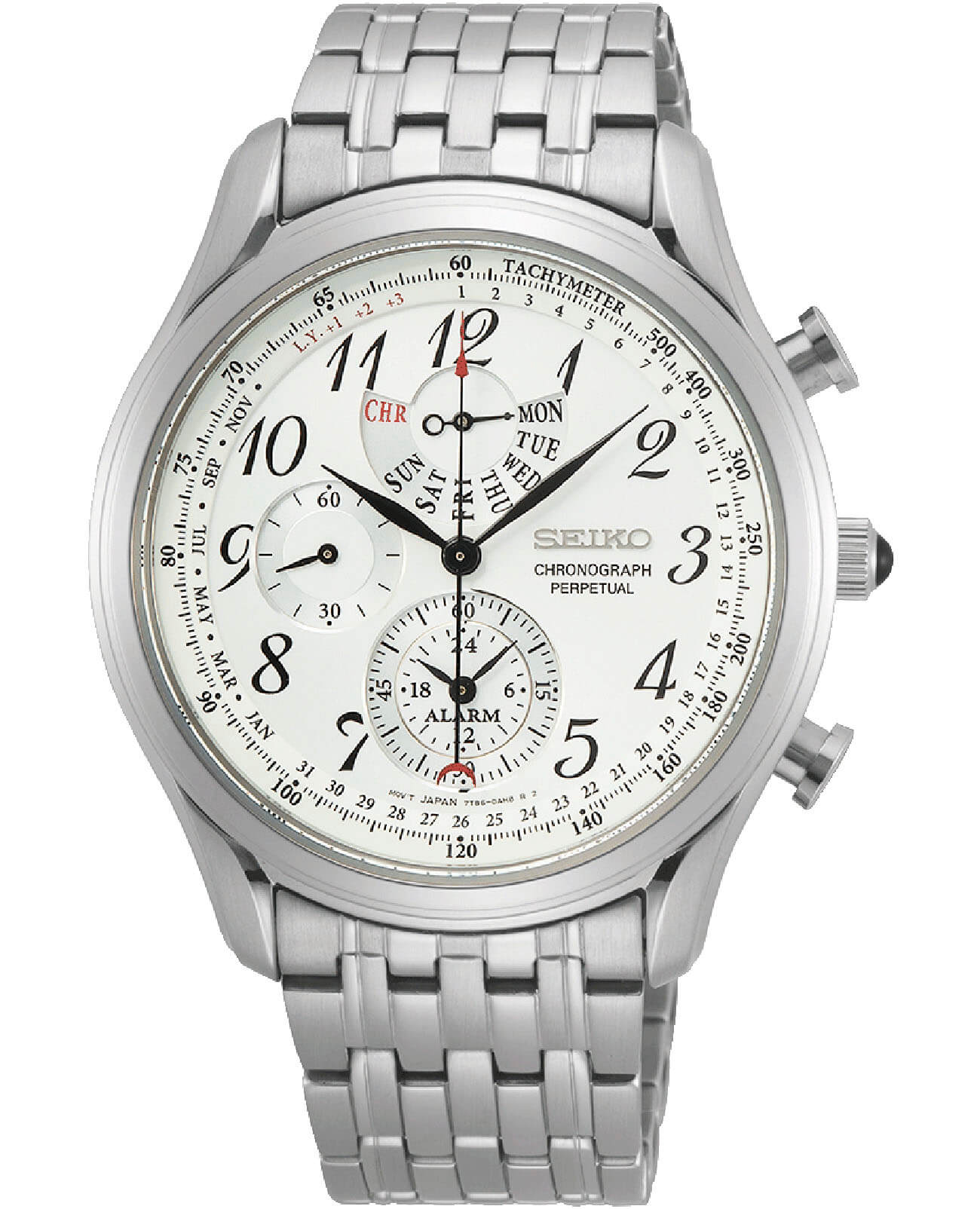 Элегантный хронографХронографФункция позволяет измерять отрезки времени с особой точностью: часы, минуты, секунды. Верным признаком хронографа является наличие на циферблате 3 дополнительных окошек-счётчиков. дополнен яркими акцентами и спортивными деталями: шкала тахиметраТахиметрРазмеченная шкала, располагается на ободке или безеле часов. Тахиметр позволяет рассчитать скорость на определённом участке пути, расстояние измеряется в километрах или милях., отображение даты, ретроградный указатель дня недели, окошко будильника и секундомера. Аксессуар будет одинаково хорошо дополнять как повседневный, так и деловой образ. Серебристый стальной браслет гармонично сочетается с отполированным кабашоном на заводной головке. Циферблат защищён прочным минеральным стеклом Hardlex, отличающимся устойчивостью к царапинам. В основе работы – кварцевый японский механизм Seiko 7T86. Надёжный корпус из нержавеющей стали 316L выдерживает высокие нагрузки. Наручные часы сохраняют водонепроницаемость при давлении 50 бар. Диаметр корпуса: 40 мм.