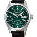 Фиксированный стальной безельБезельВнешний ободок, закрепляющий стекло. В спортивных часах так называется поворотное кольцо с делениями на циферблате, выполняет роль таймера – замеряет отрезки времени на шкале. Неподвижный безель – элемент декора. Однонаправленно вращающийся безель на дайверских часах позволяет фиксировать моменты погружения и выныривания на поверхность. подчёркивает утилитарный дизайн в стиле «field watch». Циферблат насыщенного зелёного цвета с солнечным эффектом оформлен двойной шкалой 12/24 и дополнен индикаторами даты и дня недели на позиции 3 часа. Стрелки и часовые метки покрыты люминесцентным покрытиемЛюминесцентное покрытиеПозволяет считывать показания времени в темноте. Производители наносят на стрелки, часовые индексы, безель или поверхность циферблата светонакопительный состав, дающий холодное свечение. LumiBrite для отличной читаемости в любых условиях.