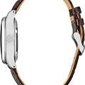 Модель комплектуется коричневым кожаным ремешком с удобной раскладной застёжкойРаскладная застёжкаТакой тип застёжки используется только на браслетах из металла. Она никогда не раскрывается полностью, происходит разделение на 2 и более частей. Раскладывающая застёжка снизит вероятность потери часов к минимуму., подчеркивающей классический стиль модели.