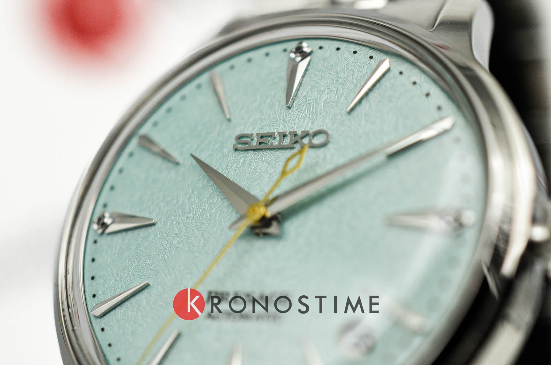 Модель Seiko Presage Cocktail Time SRPL63 вдохновлена свежестью японского коктейля Frozen Sky Diving. Часы отличаются циферблатом с четырьмя метками из драгоценных камней, что придаёт им особую роскошь и изысканность. Корпус диаметром 40 мм изготовлен из нержавеющей стали, а стекло выполнено по технологии Hardlex — это минеральное стеклоМинеральное стеклоМинеральное стекло представляет собой искусственно выращенный минерал кварца. Такое стекло отличается особой устойчивостью к повреждениям и царапинам. Уступает по некоторым качествам сапфировому стеклу. повышенной прочности, устойчивое к мелким механическим повреждениям. Механизм — автоматический калибр 4R35, обеспечивающий надёжную работу часов и запас хода до 41 часа. Функция отображения даты добавляет модели практичности. Часы водонепроницаемы до 5 атмосфер, что соответствует защите от случайных капель дождя. Браслет и застёжка выполнены из стали, оснащены раскладной застёжкойРаскладная застёжкаТакой тип застёжки используется только на браслетах из металла. Она никогда не раскрывается полностью, происходит разделение на 2 и более частей. Раскладывающая застёжка снизит вероятность потери часов к минимуму., обеспечивающей удобство ношения. Дизайн часов дополнен классическим сочетанием материалов и цветов, что делает их универсальным аксессуаром для повседневного и торжественного образа. Модель 2025 года имеет современный, лаконичный внешний вид, сохраняя при этом традиционные элементы часового мастерства Seiko.