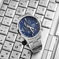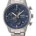 Мужские наручные часы-хронографХронографФункция позволяет измерять отрезки времени с особой точностью: часы, минуты, секунды. Верным признаком хронографа является наличие на циферблате 3 дополнительных окошек-счётчиков. Seiko SSB387P1 из коллекции Sport сочетают в себе спортивный дизайн и надежность современных технологий . Модель обладает круглым корпусом диаметром 41 мм, изготовленным из титана, что обеспечивает высокую устойчивость к внешним воздействиям и легкость при ношении . Браслет выполнен из титана с раскладной застежкойРаскладная застёжкаТакой тип застёжки используется только на браслетах из металла. Она никогда не раскрывается полностью, происходит разделение на 2 и более частей. Раскладывающая застёжка снизит вероятность потери часов к минимуму., гарантирующей комфортное ношение и безопасность . Синий текстурированный циферблат оснащен окном даты, а стрелки и метки имеют люминесцентное покрытиеЛюминесцентное покрытиеПозволяет считывать показания времени в темноте. Производители наносят на стрелки, часовые индексы, безель или поверхность циферблата светонакопительный состав, дающий холодное свечение., обеспечивающее видимость в темноте . Для защиты используется сапфировое стеклоСапфировое стеклоПрочный и надёжный материал из кристалла сапфира синтетического происхождения, характеризующийся особой твёрдостью и устойчивостью к царапинам и повреждениям., которое противостоит появлению царапин и обеспечивает длительную сохранность внешнего вида часов . Часы работают на кварцевом механизме, что гарантирует точное время без необходимости подзаводки . Модель также является хронографом, оснащенным функцией секундомераСекундомерСекундоме́р — прибор, способный измерять интервалы времени с точностью до долей секунды., позволяющего измерять интервалы времени до 12 часов с шагом в 1/5 секунды . Водонепроницаемость часов достигает 100 метров (WR 100), что позволяет использовать их во время плавания и других водных видов спорта, однако не рекомендуется для глубоководного дайвинга .
