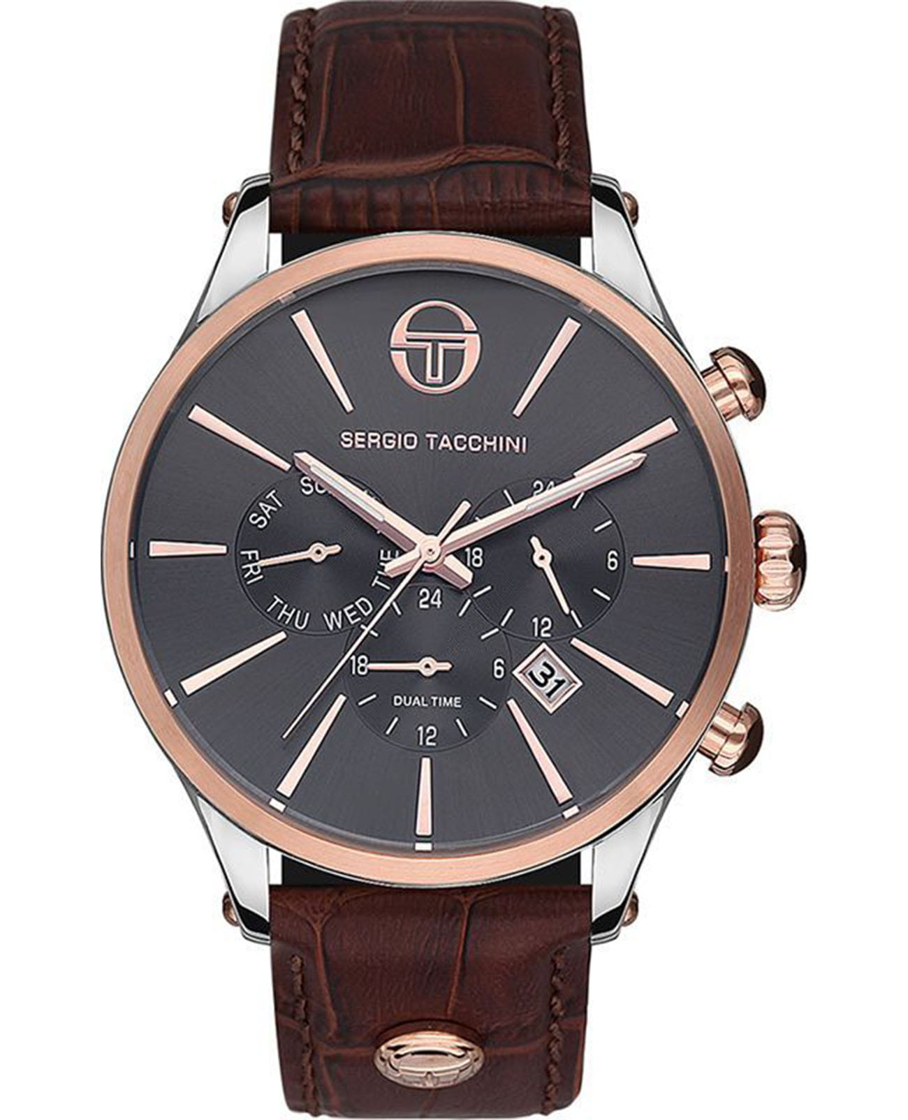 Мужские кварцевые часы Sergio Tacchini из коллекции CITY — это сочетание классического стиля и современной функциональности. Корпус диаметром 54 мм выполнен из нержавеющей стали 316L. БезельБезельВнешний ободок, закрепляющий стекло. В спортивных часах так называется поворотное кольцо с делениями на циферблате, выполняет роль таймера – замеряет отрезки времени на шкале. Неподвижный безель – элемент декора. Однонаправленно вращающийся безель на дайверских часах позволяет фиксировать моменты погружения и выныривания на поверхность. с PVD-покрытиемPVDУльтратонкое покрытие наносится в технике вакуумного напыления, сочетает в себе нитрид титана особой прочности со слоем золота или оксида хрома. Несёт в себе декоративную или защитную функцию.. Циферблат серого цвета оформлен индексами и стрелками. Указатели дня недели и даты вынесены на отдельные субциферблаты, также присутствует индикация 24-часового формата времени и второй часовой пояс. Стрелки с люминесцентным покрытиемЛюминесцентное покрытиеПозволяет считывать показания времени в темноте. Производители наносят на стрелки, часовые индексы, безель или поверхность циферблата светонакопительный состав, дающий холодное свечение., обеспечивающим хорошую читаемость в темноте. Циферблат защищён минеральным стекломМинеральное стеклоМинеральное стекло представляет собой искусственно выращенный минерал кварца. Такое стекло отличается особой устойчивостью к повреждениям и царапинам. Уступает по некоторым качествам сапфировому стеклу.. Часы оснащены кожаным ремешком коричневого цвета с стандартной застёжкой. Водонепроницаемость 100 м позволяет использовать часы для плавания и повседневного ношения. Идеальный выбор для тех, кто ценит стиль и надёжность.
