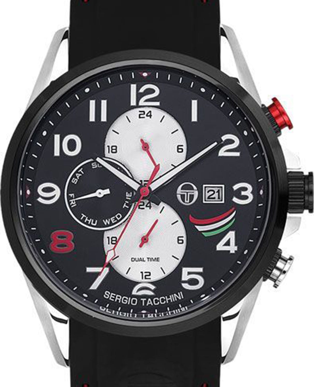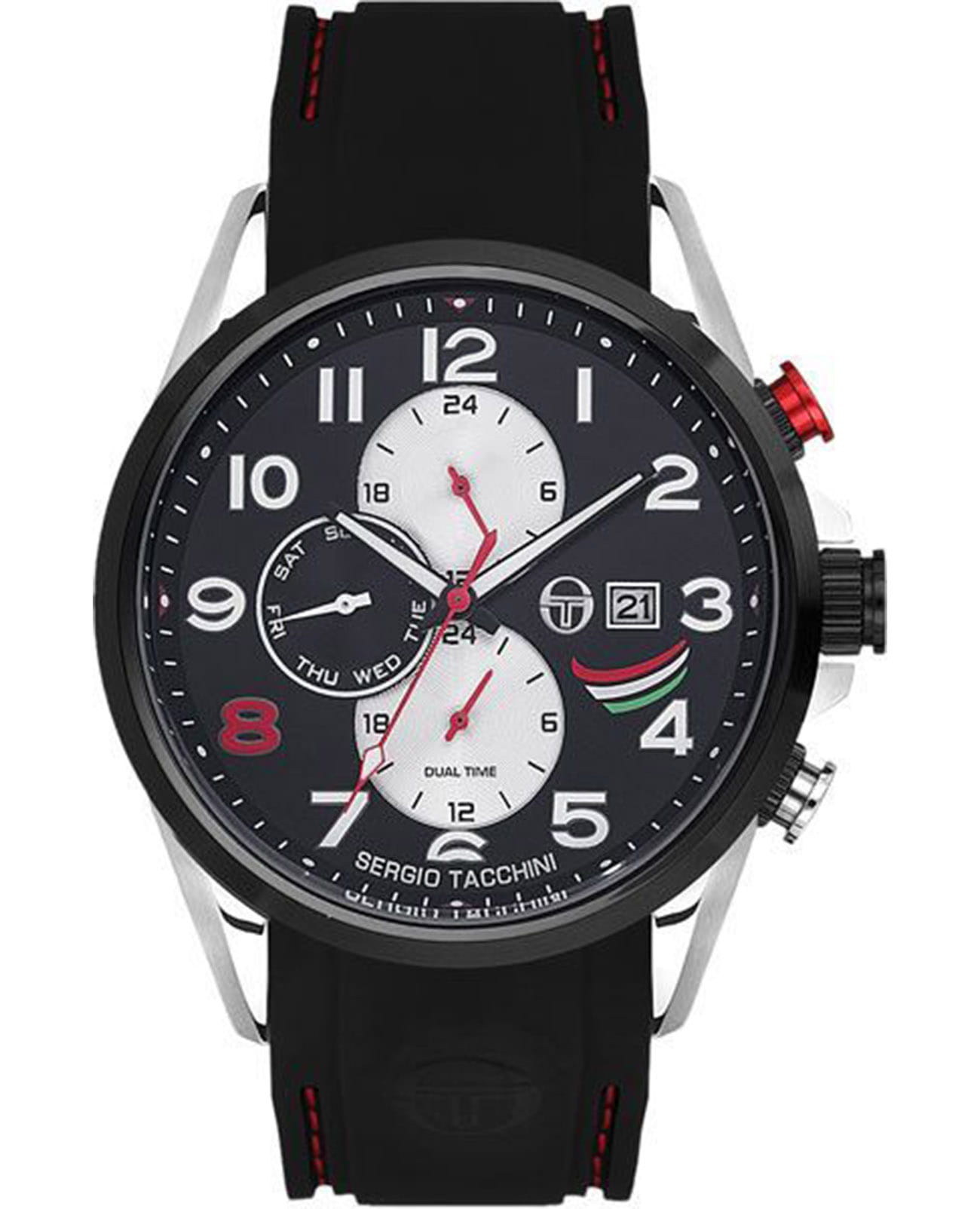 Мужские кварцевые часы Sergio Tacchini из коллекции Archivio — это надёжный спортивный аксессуар с функциональным дизайном. Корпус диаметром 46,5 мм выполнен из нержавеющей стали 316L. БезельБезельВнешний ободок, закрепляющий стекло. В спортивных часах так называется поворотное кольцо с делениями на циферблате, выполняет роль таймера – замеряет отрезки времени на шкале. Неподвижный безель – элемент декора. Однонаправленно вращающийся безель на дайверских часах позволяет фиксировать моменты погружения и выныривания на поверхность. с PVD-покрытиемPVDУльтратонкое покрытие наносится в технике вакуумного напыления, сочетает в себе нитрид титана особой прочности со слоем золота или оксида хрома. Несёт в себе декоративную или защитную функцию.. Циферблат чёрного цвета оформлен индексами и стрелками. Указатели дня недели и даты вынесены на отдельные субциферблаты, также присутствует индикация 24-часового формата времени и второй часовой пояс. Стрелки с люминесцентным покрытиемЛюминесцентное покрытиеПозволяет считывать показания времени в темноте. Производители наносят на стрелки, часовые индексы, безель или поверхность циферблата светонакопительный состав, дающий холодное свечение., обеспечивающим хорошую читаемость в темноте. Циферблат защищён минеральным стекломМинеральное стеклоМинеральное стекло представляет собой искусственно выращенный минерал кварца. Такое стекло отличается особой устойчивостью к повреждениям и царапинам. Уступает по некоторым качествам сапфировому стеклу. с антибликовым покрытиемАнтибликовое покрытиеСлой оксида металла в 0,13-0,3 микрон, благодаря которому стекло часов не бликует и не отражает свет. Антибликовое покрытие уменьшает отражение света в 10 раз, обеспечивая отличную читаемость показателей циферблата.. Часы оснащены силиконовым ремешком чёрного цвета с стандартной застёжкой. Водонепроницаемость 50 м позволяет использовать часы в повседневных условиях. Идеальный выбор для тех, кто ценит стиль, функциональность и комфорт.