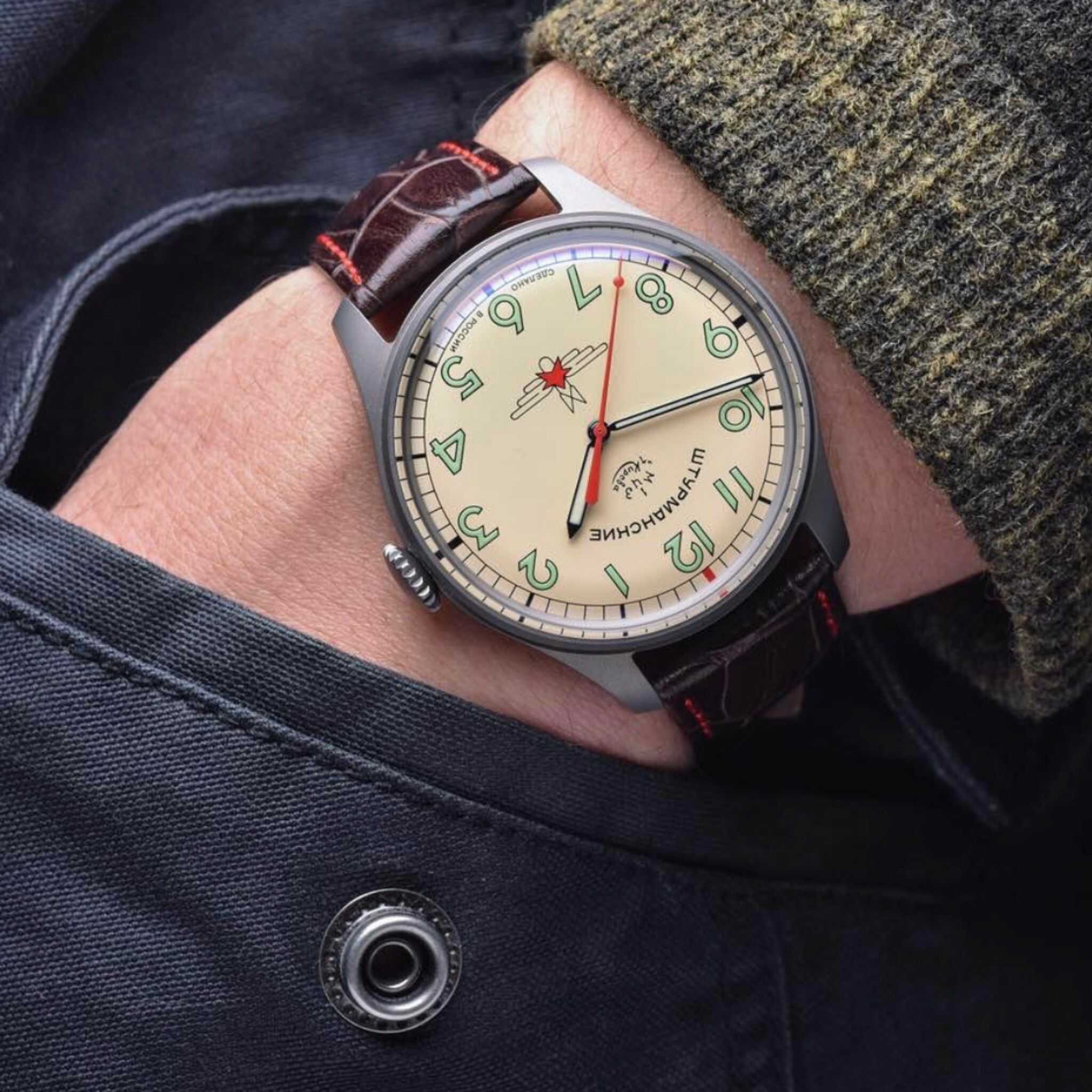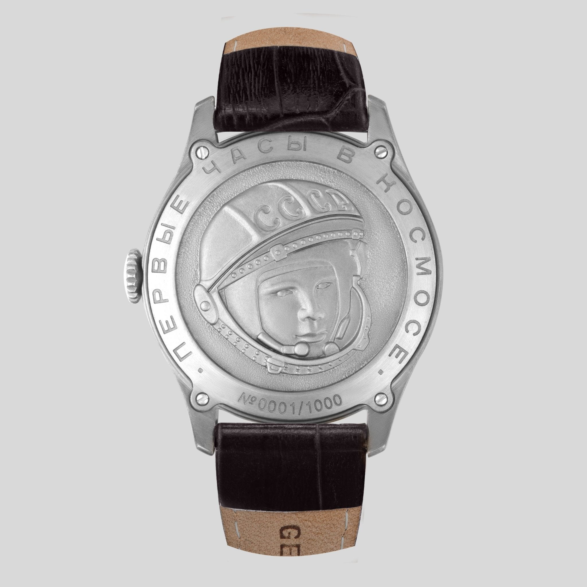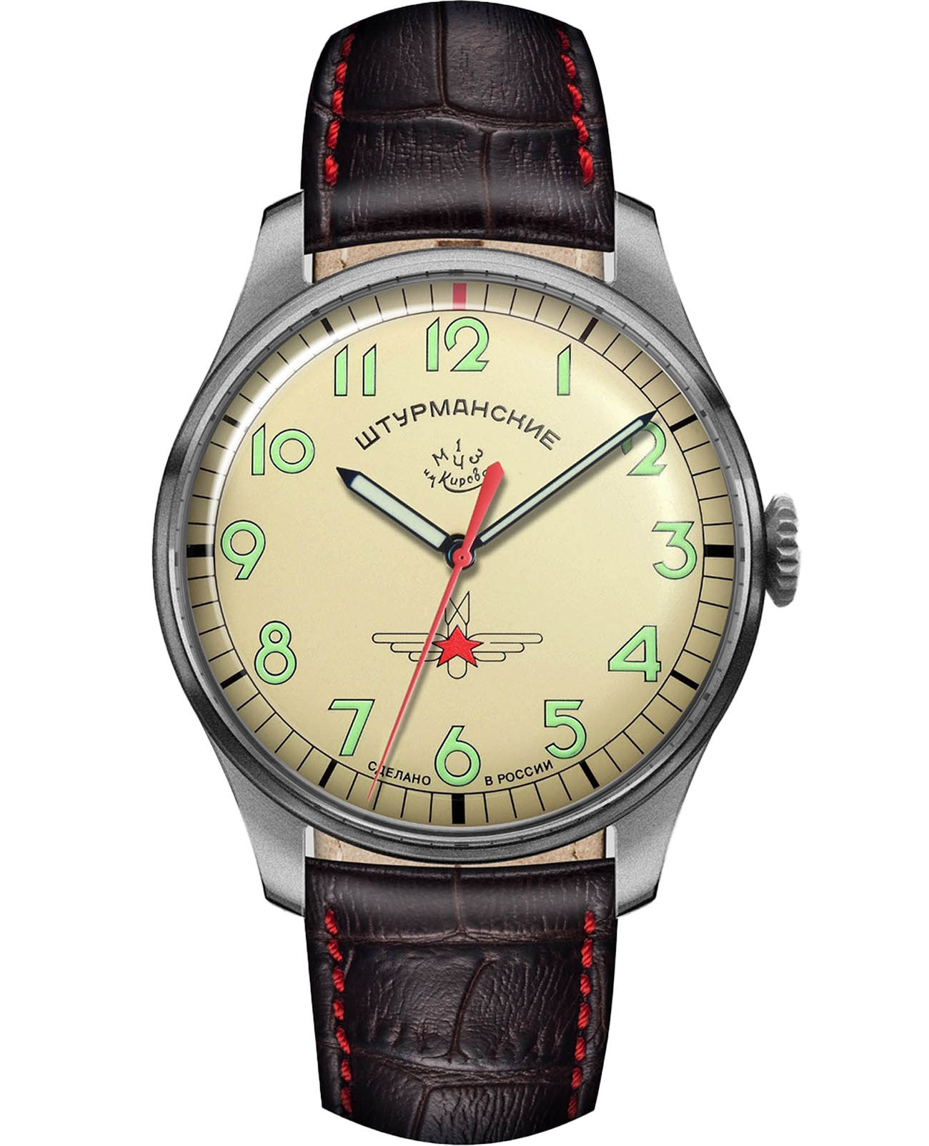 Мужские российские механические часы Штурманские Гагарин Наследие 2609/3747128, механический механизм (автоматический калибр) с высокой точностью. Минеральное стеклоМинеральное стеклоМинеральное стекло представляет собой искусственно выращенный минерал кварца. Такое стекло отличается особой устойчивостью к повреждениям и царапинам. Уступает по некоторым качествам сапфировому стеклу. устойчивое к мелким механическим повреждениям. Класс водозащиты: 50 метров, позволит защитить корпус от случайных брызг или капель дождя. Корпус часов изготовлен из титана. Кожаный ремешок на стандартной застёжке. Стрелки и метки с люминесцентным покрытиемЛюминесцентное покрытиеПозволяет считывать показания времени в темноте. Производители наносят на стрелки, часовые индексы, безель или поверхность циферблата светонакопительный состав, дающий холодное свечение.. Чёткая, читаемая минутная шкала уходит за приделы видимой области циферблата, подчёркивая изящность ободка корпуса. Оцифровка циферблата – отличительная особенность данной модели, её дизайн не изменился с самой первый, гагаринской серии. Заводная головка конической формы с удобной насечкой повторяет дизайн оригинальной модели.