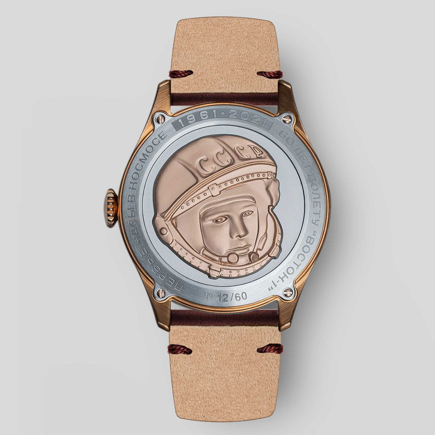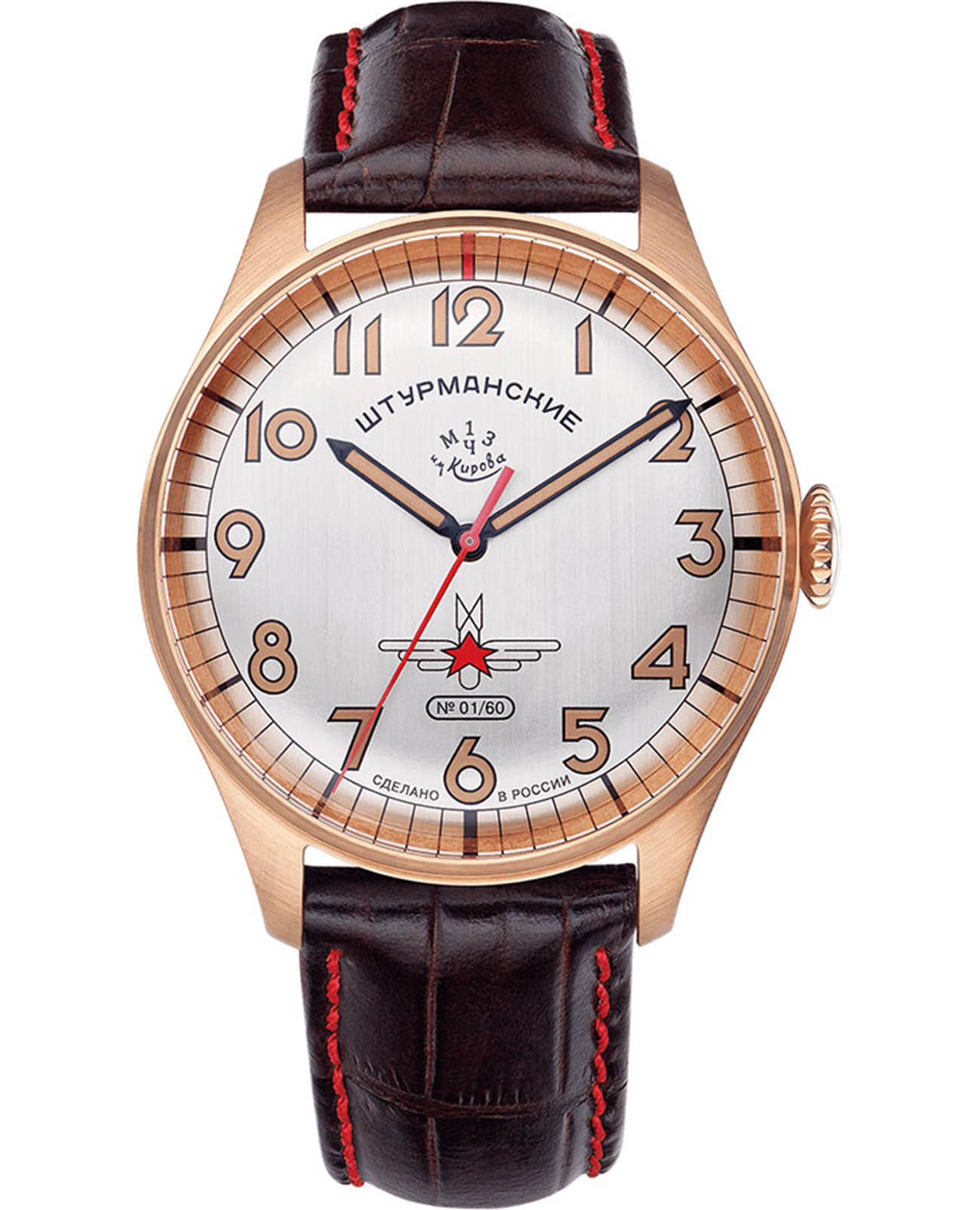 Лимитированные мужские российские механические часы Штурманские Гагарин Наследие 2609/3778060, механический механизм (автоматический калибр) с высокой точностью. Сапфировое стеклоСапфировое стеклоПрочный и надёжный материал из кристалла сапфира синтетического происхождения, характеризующийся особой твёрдостью и устойчивостью к царапинам и повреждениям. устойчивое к мелким механическим повреждениям. Класс водозащиты: 30 метров, позволит защитить корпус от случайных брызг или капель дождя. Корпус часов изготовлен из бронзы. Кожаный ремешок на стандартной застёжке. Стрелки и метки с люминесцентным покрытиемЛюминесцентное покрытиеПозволяет считывать показания времени в темноте. Производители наносят на стрелки, часовые индексы, безель или поверхность циферблата светонакопительный состав, дающий холодное свечение.. Задняя крышка с барельефом Гагарина. Чёткая, читаемая минутная шкала уходит за приделы видимой области циферблата, подчёркивая изящность ободка корпуса. Оцифровка циферблата – отличительная особенность данной модели, её дизайн не изменился с самой первый, гагаринской серии. Заводная головка конической формы с удобной насечкой повторяет дизайн оригинальной модели.