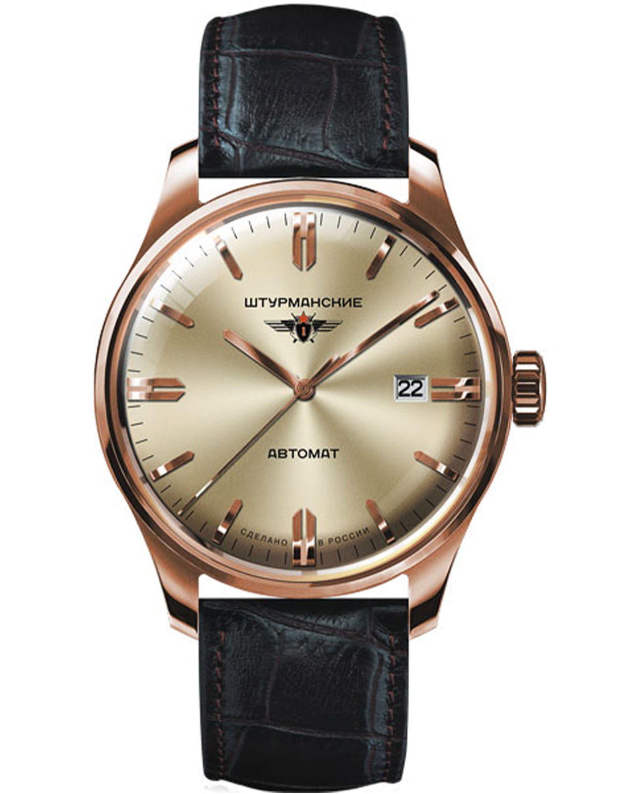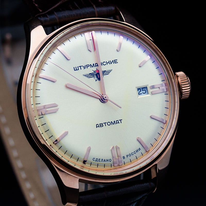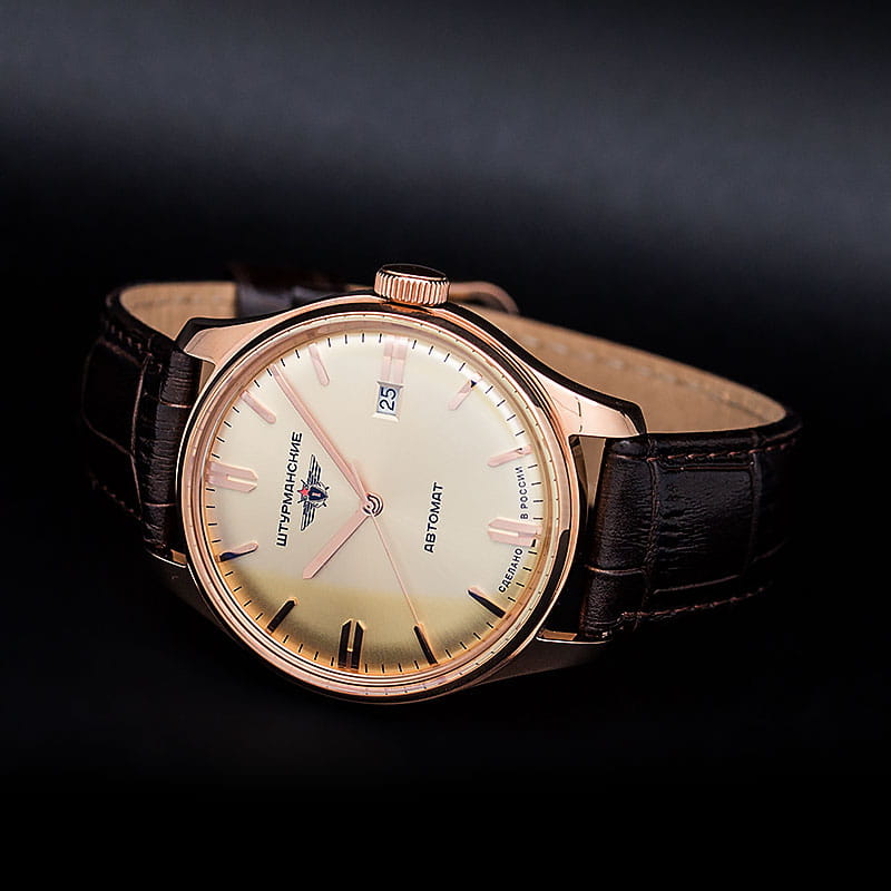Мужские российские механические часы с минеральным стекломМинеральное стеклоМинеральное стекло представляет собой искусственно выращенный минерал кварца. Такое стекло отличается особой устойчивостью к повреждениям и царапинам. Уступает по некоторым качествам сапфировому стеклу. Штурманские Гагарин 9015/1279164, механизм с высокой точностью. Класс водозащиты: 50 метров, позволит защитить корпус от случайных брызг или капель дождя. Корпус часов изготовлен из стали с PVD-покрытиемPVDУльтратонкое покрытие наносится в технике вакуумного напыления, сочетает в себе нитрид титана особой прочности со слоем золота или оксида хрома. Несёт в себе декоративную или защитную функцию.. Кожаный ремешок на стандартной застёжке. Стрелки и метки с люминесцентным покрытиемЛюминесцентное покрытиеПозволяет считывать показания времени в темноте. Производители наносят на стрелки, часовые индексы, безель или поверхность циферблата светонакопительный состав, дающий холодное свечение.. Калибр Miyota 9015. В механизме 24 камня, частота 28800 полуколебаний в час. Запас хода 42 часа. Апертура даты.