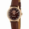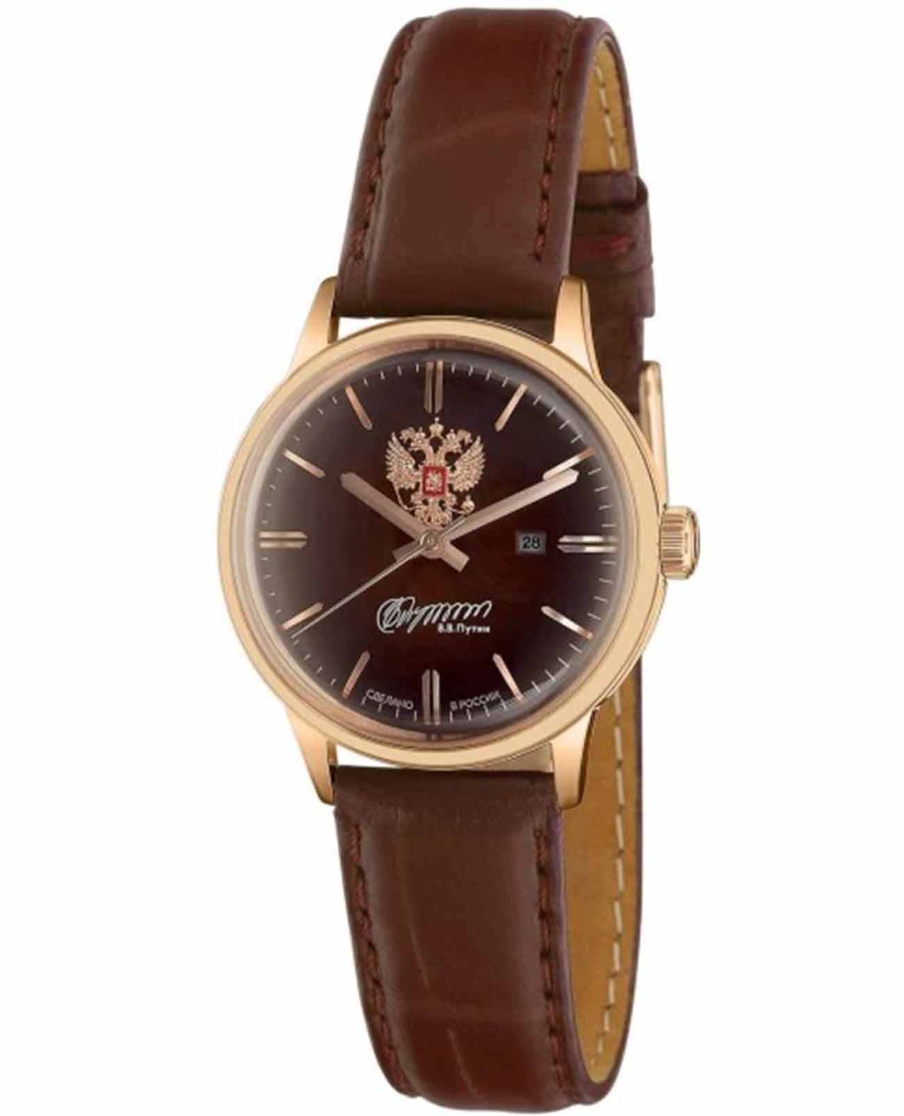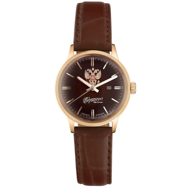 Российские механические наручные часы Слава 1873097/300-6Т15 станут стильным и надежным аксессуаром для вашего образа. Эти элегантные часы созданы с акцентом на высокое качество и изысканный дизайн. Оборудованные механизмом Miyota 6T15 с автоподзаводом, они обеспечивают точность и надежность, поддерживая запас хода до 40 часов. Часы заключены в прочный стальной корпус с IP-покрытиемIP-покрытиеМетод ионного напыления. Демонстрирует повышенную устойчивость к истиранию, окислению и химическим веществам. Под воздействием высокого давления и температуры около 1500°C молекулы металла надёжно соединяются с частицами корпуса часов. диаметром 32 мм и минеральным стекломМинеральное стеклоМинеральное стекло представляет собой искусственно выращенный минерал кварца. Такое стекло отличается особой устойчивостью к повреждениям и царапинам. Уступает по некоторым качествам сапфировому стеклу., что обеспечивает надежную защиту и долговечность. Коричневый циферблат украшен изображением герба Российской Федерации и автографом В.В. Путина. Широкие заостренные стрелки в стиле Baton и штриховые метки придают циферблату выразительность и читаемость. Часы оснащены календарем с окошком даты на 3 часах, что делает их еще более функциональными. Рифленая заводная головка и завинчивающаяся задняя крышка добавляют изделию надежности и комфорта в использовании. Завершает образ текстурированный кожаный ремешок коричневого цвета с классической застежкой, который обеспечивает удобную посадку на запястье. Благодаря водозащите до 50WR, эти часы подойдут для повседневного использования, сохраняя свой безупречный вид и функциональность.