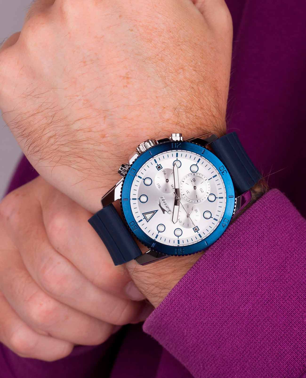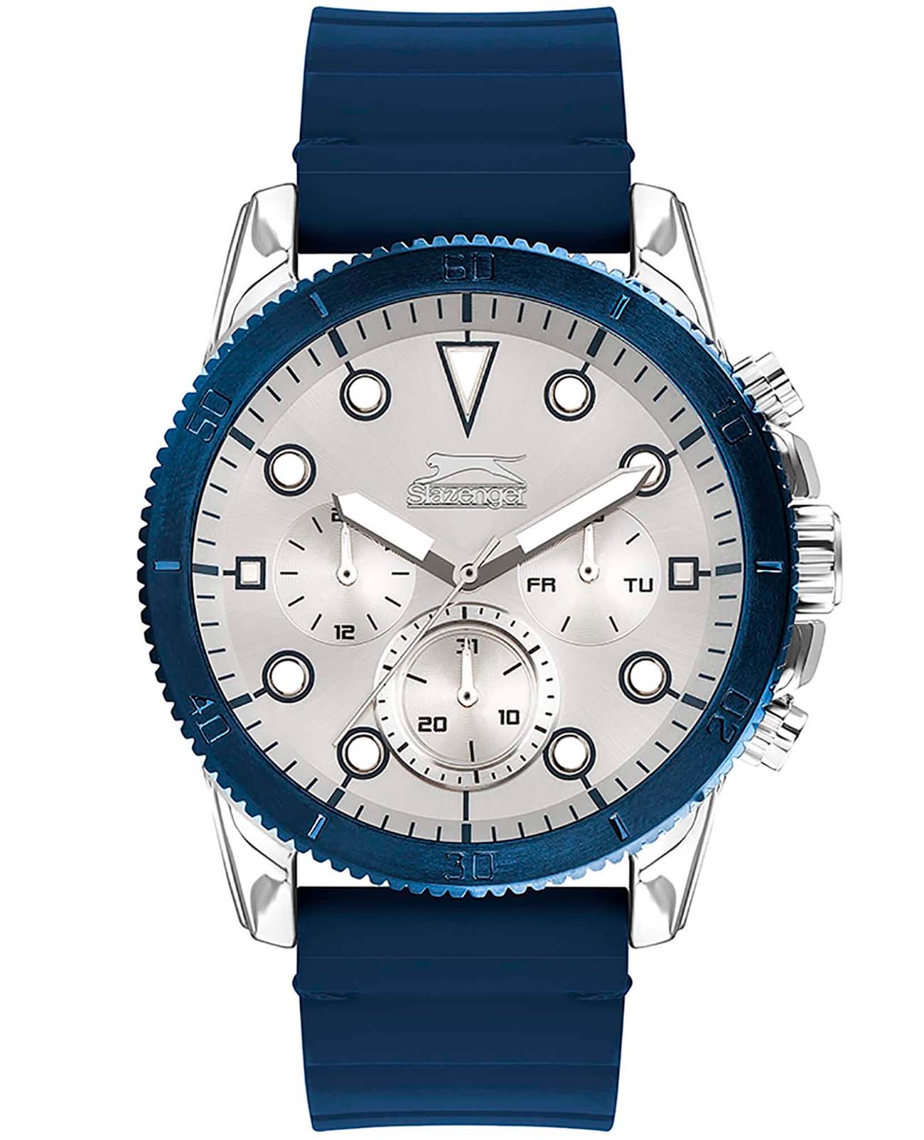 Мужские наручные часы Slazenger SL.09.2012.2.02 сочетают в себе практичный дизайн и надежность современных технологий. Модель обладает круглым корпусом диаметром 47 мм, изготовленным из суперметалла, что обеспечивает высокую устойчивость к внешним воздействиям. БезельБезельВнешний ободок, закрепляющий стекло. В спортивных часах так называется поворотное кольцо с делениями на циферблате, выполняет роль таймера – замеряет отрезки времени на шкале. Неподвижный безель – элемент декора. Однонаправленно вращающийся безель на дайверских часах позволяет фиксировать моменты погружения и выныривания на поверхность. с IP-покрытиемIP-покрытиеМетод ионного напыления. Демонстрирует повышенную устойчивость к истиранию, окислению и химическим веществам. Под воздействием высокого давления и температуры около 1500°C молекулы металла надёжно соединяются с частицами корпуса часов.. Ремешок выполнен из силикона, а застежка стандартная, гарантирующая комфортное ношение и безопасность. Серебристый циферблат дополнен индексами и тремя малыми циферблатами для отображения даты, дня недели и текущего времени в формате 24 часа, а также защищен прочным минеральным стекломМинеральное стеклоМинеральное стекло представляет собой искусственно выращенный минерал кварца. Такое стекло отличается особой устойчивостью к повреждениям и царапинам. Уступает по некоторым качествам сапфировому стеклу. с люминесцентным покрытиемЛюминесцентное покрытиеПозволяет считывать показания времени в темноте. Производители наносят на стрелки, часовые индексы, безель или поверхность циферблата светонакопительный состав, дающий холодное свечение. для лучшей видимости в темноте. Часы работают на кварцевом механизме, что гарантирует точное время без необходимости подзаводки. Водонепроницаемость часов достигает уровня WR50 (5 атмосфер), что позволяет использовать их во время плавания, однако не рекомендуется для глубоководного дайвинга. Вес часов составляет около 102 грамма, что делает их удобными для длительного ношения.