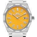 Часы Slazenger SL.09.2143.1.06 воплощают в себе элегантность и практичность, идеально подходящие для современных мужчин. Их желтый циферблат защищен минеральным стекломМинеральное стеклоМинеральное стекло представляет собой искусственно выращенный минерал кварца. Такое стекло отличается особой устойчивостью к повреждениям и царапинам. Уступает по некоторым качествам сапфировому стеклу. и заключен в серебристый корпус диаметром 41,5 мм, который изготовлен из прочного суперметалла. Окошко даты расположено в положении 3 часов. Надежный кварцевый механизм обеспечивает точность, а водозащита 5 ATM делает их устойчивыми к воздействию воды. Браслет из суперметалла имеет раскладную застёжкуРаскладная застёжкаТакой тип застёжки используется только на браслетах из металла. Она никогда не раскрывается полностью, происходит разделение на 2 и более частей. Раскладывающая застёжка снизит вероятность потери часов к минимуму., что подчеркивает современный стиль и позволяет легко снимать часы. Ширина браслета 22-26 мм.