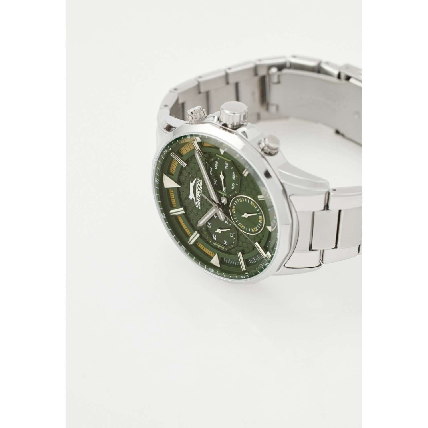 Стильные мужские наручные часы Slazenger SL.09.2216.2.03 станут идеальным аксессуаром для современного мужчины. Этот британский бренд славится своим качеством и надежностью, а данная модель не является исключением. Часы оснащены кварцевым механизмом, что обеспечивает точность хода и долговечность использования. Корпус часов выполнен из металла, а прочное  минеральное стеклоМинеральное стеклоМинеральное стекло представляет собой искусственно выращенный минерал кварца. Такое стекло отличается особой устойчивостью к повреждениям и царапинам. Уступает по некоторым качествам сапфировому стеклу. защищает циферблат от царапин и повреждений. Элегантный металлический браслет серебристого цвета снабжен удобной раскладной застёжкойРаскладная застёжкаТакой тип застёжки используется только на браслетах из металла. Она никогда не раскрывается полностью, происходит разделение на 2 и более частей. Раскладывающая застёжка снизит вероятность потери часов к минимуму., что гарантирует комфортное ношение на запястье. Ширина браслета составляет 22 мм, что придает часам солидный вид. Диаметр корпуса равен 45 мм, а толщина 12 мм, что делает эту модель заметной, но в то же время не громоздкой. Водозащита уровня WR 50 позволяет использовать часы в повседневной жизни, не беспокоясь о случайных попаданиях воды. Стрелки снабжены люминесцентным покрытиемЛюминесцентное покрытиеПозволяет считывать показания времени в темноте. Производители наносят на стрелки, часовые индексы, безель или поверхность циферблата светонакопительный состав, дающий холодное свечение., что позволяет легко считывать время в темноте. Функциональные возможности часов включают отображение даты, дня недели и времени в 24-часовом формате на дополнительных малых циферблатах. Это делает модель не только стильной, но и практичной в использовании.