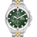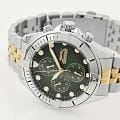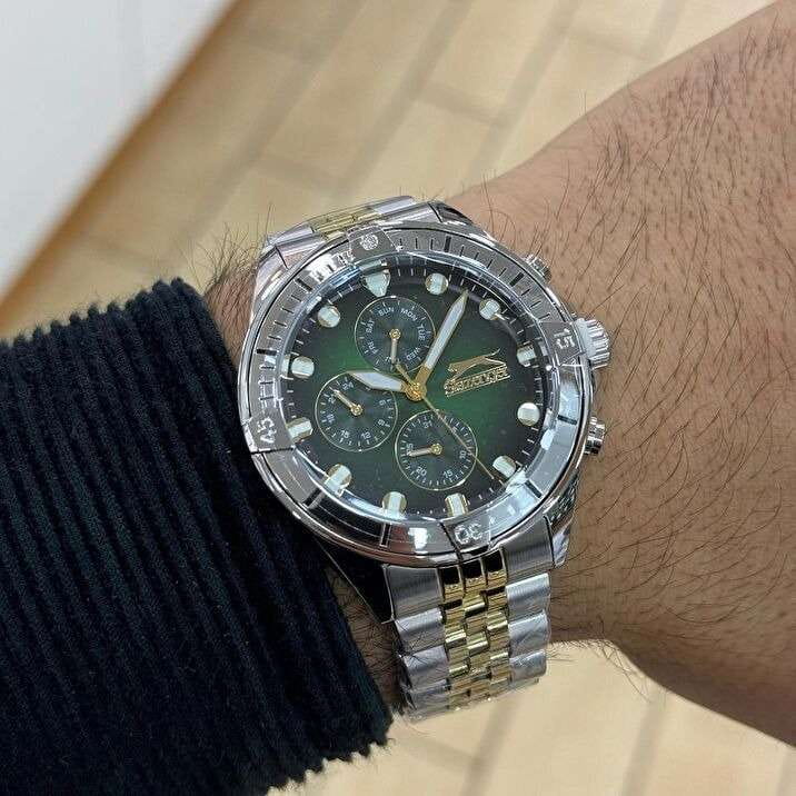 Часы Slazenger SL.09.2227.2.04 — это стильная и функциональная модель, созданная для современных мужчин, ценящих качество и надежность. Корпус из прочного металла и безельБезельВнешний ободок, закрепляющий стекло. В спортивных часах так называется поворотное кольцо с делениями на циферблате, выполняет роль таймера – замеряет отрезки времени на шкале. Неподвижный безель – элемент декора. Однонаправленно вращающийся безель на дайверских часах позволяет фиксировать моменты погружения и выныривания на поверхность. диаметром 46 мм и толщиной 12 мм придаёт часам солидный вид, а серебристый металлический браслет с частичным золотистым IP-покрытиемIP-покрытиеМетод ионного напыления. Демонстрирует повышенную устойчивость к истиранию, окислению и химическим веществам. Под воздействием высокого давления и температуры около 1500°C молекулы металла надёжно соединяются с частицами корпуса часов. с раскладной застёжкойРаскладная застёжкаТакой тип застёжки используется только на браслетах из металла. Она никогда не раскрывается полностью, происходит разделение на 2 и более частей. Раскладывающая застёжка снизит вероятность потери часов к минимуму. обеспечивает удобство при ношении. Надежный кварцевый механизм гарантирует точность хода, а минеральное стеклоМинеральное стеклоМинеральное стекло представляет собой искусственно выращенный минерал кварца. Такое стекло отличается особой устойчивостью к повреждениям и царапинам. Уступает по некоторым качествам сапфировому стеклу. защищает градиентный зеленый циферблат от царапин. Модель оснащена дополнительными малыми циферблатами, отображающими дату, день недели и текущее время в 24-часовом формате, что делает часы особенно практичными. Для удобства использования в темное время суток предусмотрено люминесцентное покрытиеЛюминесцентное покрытиеПозволяет считывать показания времени в темноте. Производители наносят на стрелки, часовые индексы, безель или поверхность циферблата светонакопительный состав, дающий холодное свечение. стрелок. Заводная головка имеет специальную защиту. Водозащита уровня WR 50 позволяет не беспокоиться о случайном попадании воды. Вес изделия составляет 161 грамм. Эти часы станут отличным выбором для тех, кто ценит элегантность и функциональность в одном аксессуаре.